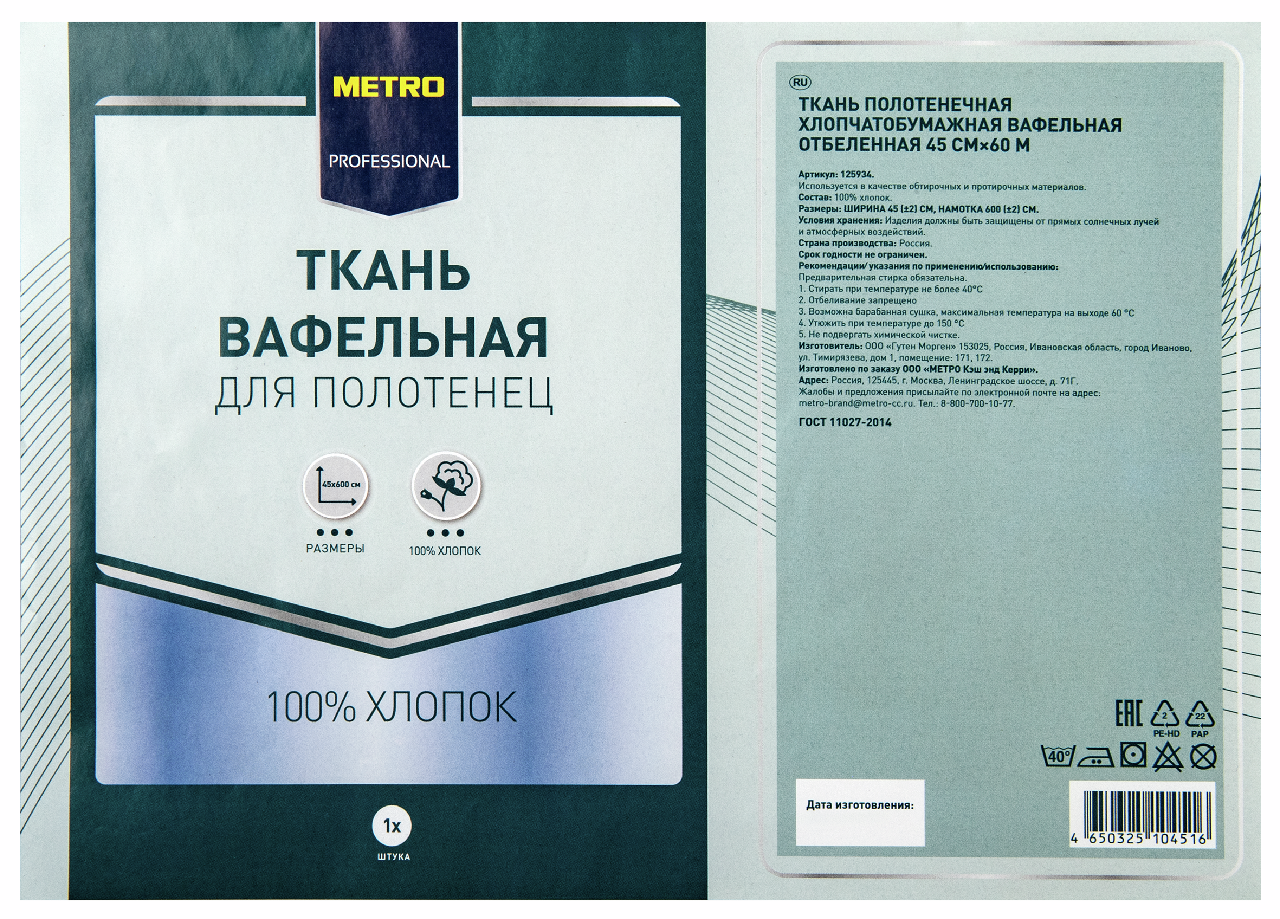 METRO PROFESSIONAL Ткань вафельная широкая 100% хлопок, 45 см (60 м) — натуральный материал высокого качества, который предназначен для пошива полотенец. Вафельные полотенца могут быть отшиты как в большом, так и в маленьком размере. Их можно применять не только на кухне, но еще и в ванне. Ширина ткани составляет 45 см, а длина отреза — 60 м. Представленный материал производят из 100%-ого хлопка. Он хорошо впитывает влагу, быстро высыхает и обладает высокой износостойкостью — не протирается, не дает усадки и не меняет оттенок даже после многочисленных стирок. Хлопковые полотенца можно стирать как вручную, так и в стиральной машине. Такая ткань подходит для шитья дома и на производстве. Ее выпускают в герметичных пакетах, защищающих ее от случайного загрязнения.