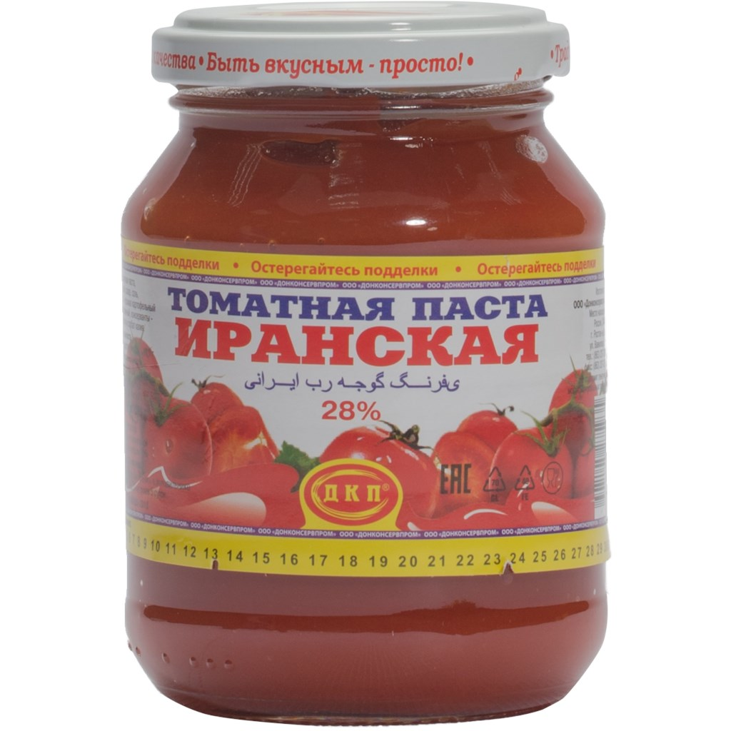 Паста томатная ДКП Иранская 28% производится из отборных и экологически чистых томатов по новейшим технологиям и на современном оборудовании. Паста обладает нежным вкусом спелых томатов и аромат свежих помидор. Хорошо сочетается с мясом, птицей, овощами, рисом, макаронными изделиями, а также в приготовлении различных соусов.
