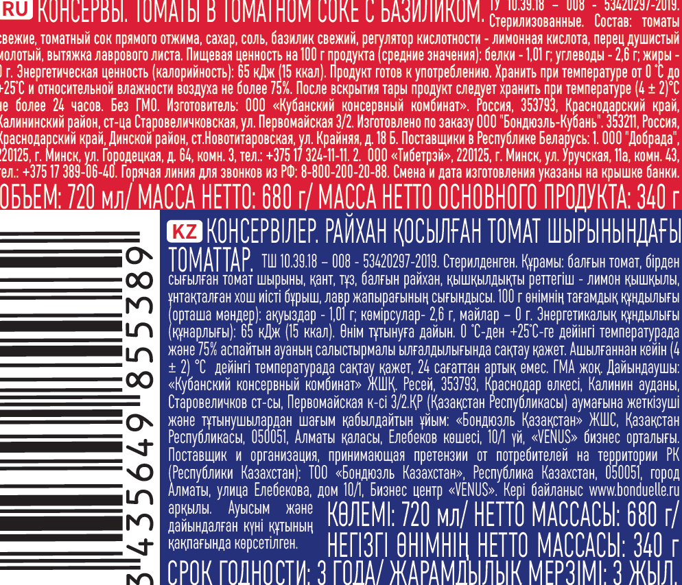 Томаты свежие, томатный сок прямого отжима, сахар, соль, базилик свежий, регулятор кислотности – лимонная кислота, перец душистый молотый, лавровый лист.