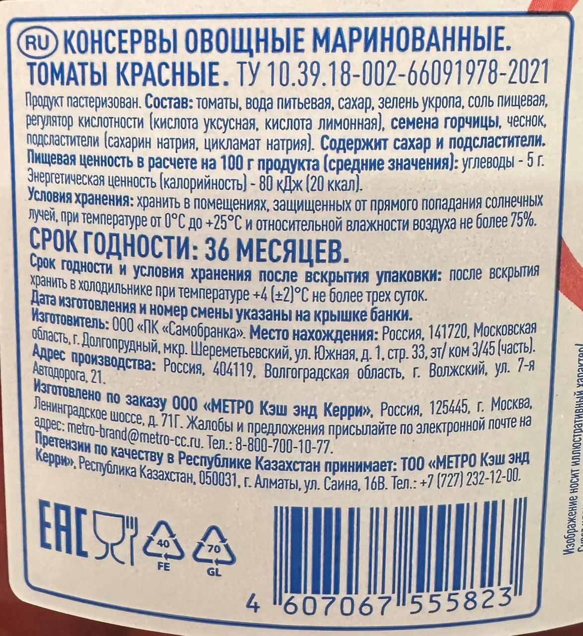 Томаты, вода питьевая, сахар, зелень укропа, соль пищевая, регулятор кислотности (кислота уксусная, кислота лимонная), семена горчицы, чеснок, подсластители (сахарин натрия, цикломат натрия).