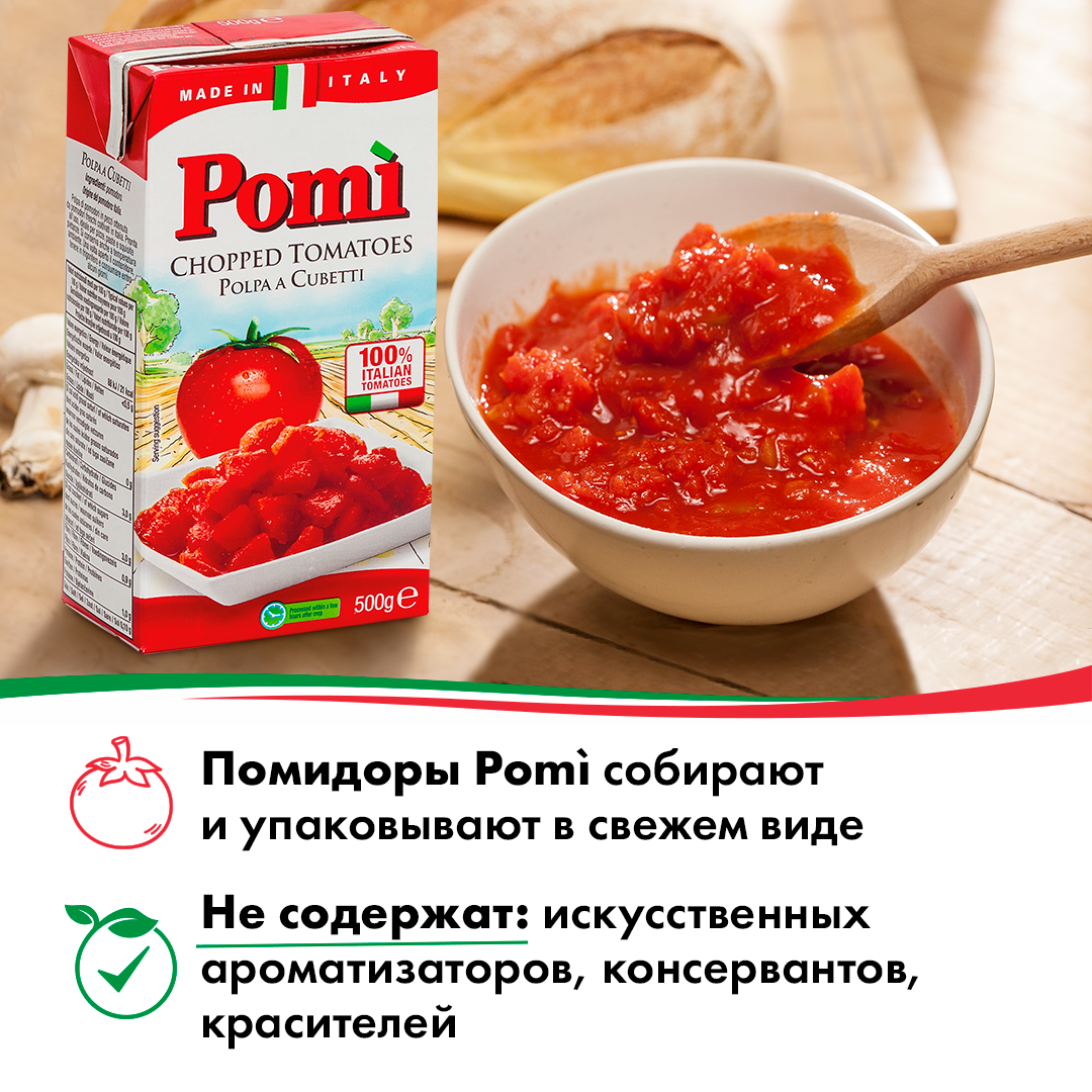 Приготовлено только из свежих помидоров. Быстро и удобно. Свежая мякоть очищенных помидоров нарезана крупными кубиками. Идеально подходит для приготовления соусов, разнообразных блюд из макарон (итальянской пасты), пиццы, мясных и рыбных блюд. 100% натуральный продукт. Приготовлено без добавления воды.