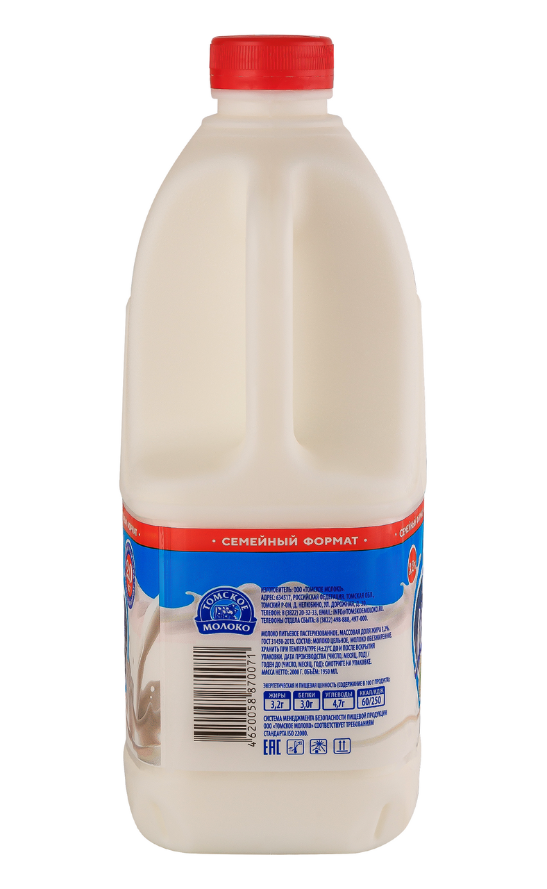 Молоко Томское молоко пастеризованное 3.2%, 2кг – натуральный продукт, изготовленный из нормализованного коровьего молока. В процессе обработки молоко проходит процесс пастеризации, что значительно увеличивает срок годности и улучшает вкусовые качества продукта. Молоко обладает насыщенным вкусом, характерным ароматом, идеально подходит для каждодневного употребления. Выпускается в удобной пластиковой бутылке в виде канистры с ручкой и крышкой. Бутылку прямоугольной формы удобно хранить в холодильнике, наливать из нее молоко.