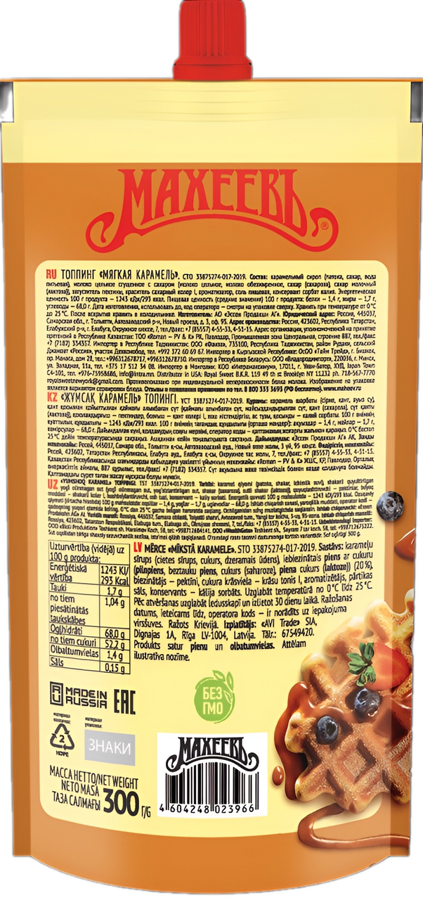Карамельный сироп патока, сахар, вода питьевая, молоко цельное сгущенное с сахаром молоко цельное, молоко обезжиренное, сахар сахароза, сахар молочный лактоза, загуститель пектины, краситель сахарный колер I, ароматизатор, соль пищевая, консервант сорбат калия.
