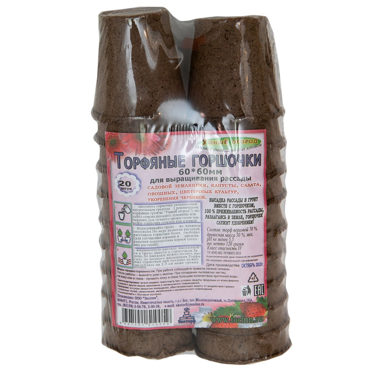 Горшочки Умный Огород торфяные 6 х 6см, 20шт