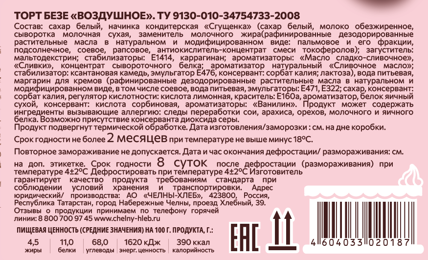 Сахар белый, начинка кондитерская Сгущенка (сахар белый, молоко обезжиренное, сыворотка молочная сухая, заменитель молочного жира (рафинированные дезодорированные растительные масла в натуральном и модифицированном виде: пальмовое и его фракции, подсолнечное, соевое, рапсовое, антиокислитель-концентрат смеси токоферолов), загуститель: мальтодекстрин, стабилизаторы: E1414, каррагинан, ароматизаторы: Масло сладко-сливочное, Сливки, концентрат сывороточного белка, ароматизатор натуральный Сливочное масло, стабилизатор: ксантановая камедь, эмульгатор E476, консервант: сорбат калия, лактоза), вода питьевая, маргарин для кремов (рафинированные дезодорированные растительные масла в натуральном и модифицированном виде, в том числе соевое, вода питьевая, эмульгаторы: E471, E322, сахар, консервант: сорбат калия, регулятор кислотности: кислота лимонная, краситель: E160а, ароматизатор, белок яичный сухой, консервант: кислота сорбиновая, ароматизаторы: Ванилин.