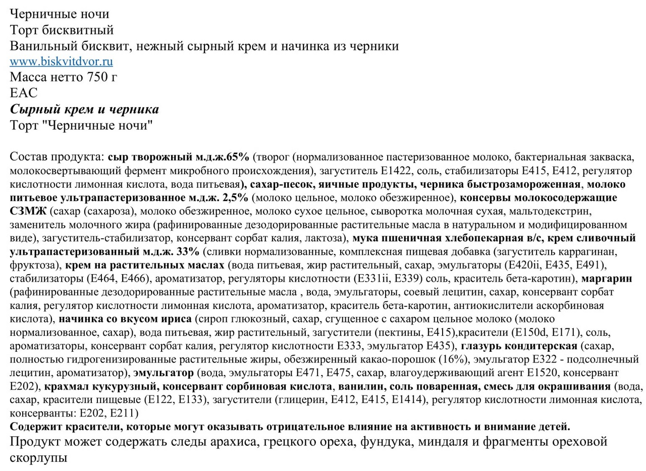 Сыр творожный творог нормализованное пастеризованное молоко, бактериальная закваска, молокосвертывающий фермент микробного происхождения, загуститель Е1422, соль, стабилизаторы Е415, Е412, регулятор кислотности лимонная кислота, вода питьевая, сахар-песок, яичные продукты, черника быстрозамороженная, молоко питьевое ультрапастеризованное молоко цельное, молоко обезжиренное, консервы молокосодержащие СЗМЖ сахар сахароза, молоко обезжиренное, молоко сухое цельное, сыворотка молочная сухая, мальтодекстрин, заменитель молочного жира рафинированные дезодорированные растительные масла в натуральном и модифицированном виде, загуститель-стабилизатор, консервант сорбат калия, лактоза, мука пшеничная хлебопекарная, крем сливочный ультрапастеризованный, сливки нормализованные, комплексная пищевая добавка загуститель каррагинан, фруктоза, крем на растительных маслах вода питьевая, жир растительный, сахар, эмульгаторы Е420ii, Е435, Е491, стабилизаторы Е464, Е466, ароматизатор, регуляторы кислотности Е331ii, Е339, соль, краситель бета-каротин, маргарин рафинированные дезодорированные растительные масла, вода, эмульгаторы, соевый лецитин, сахар, консервант сорбат калия, регулятор кислотности лимонная кислота, ароматизатор, краситель бета-каротин, антиокислители аскорбиновая кислота, начинка со вкусом ириса сироп глюкозный, сахар, сгущённое с сахаром цельное молоко, нормализованное молоко, сахар, вода питьевая, жир растительный, загустители пектины, Е415, красители Е150d, Е171, соль, ароматизаторы, консервант сорбат калия, регулятор кислотности Е333, эмульгатор Е435, глазурь кондитерская сахар, полностью гидрогенизированные растительные жиры, обезжиренный какао-порошок, эмульгатор Е322 - подсолнечный лецитин, ароматизатор, эмульгатор вода, эмульгаторы Е471, Е475.