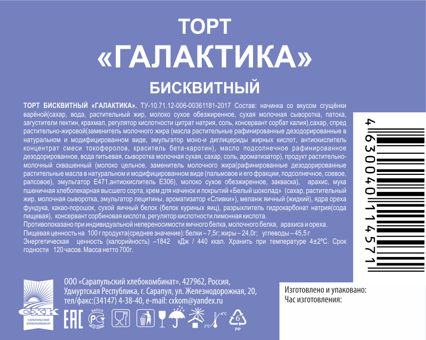 Начинка со вкусом сгущёнки варёной (сахар, вода, растительный жир, молоко сухое обезжиренное, сухая молочная сыворотка, патока, загустители пектин, крахмал, регулятор кислотности цитрат натрия, соль, консервант сорбат калия), сахар, спред растительно-жировой (заменитель молочного жира (масла растительные рафинированные дезодорированные в натуральном и модифицированном виде, эмульгатор моно-и диглицериды жирных кислот, антиокислитель концентрат смеси токоферолов, краситель бета-каротин), масло подсолнечное рафинированное дезодорированное, вода питьевая, сыворотка молочная сухая, сахар, соль, ароматизатор), продукт растительно-молочный сквашенный (молоко цельное, заменитель молочного жира (рафинированные дезодорированные растительные масла в натуральном и модифицированном виде (пальмовое и его фракции, подсолнечное, соевое, рапсовое), эмульгатор Е471,антиокислитель Е306), молоко сухое обезжиренное, закваска), арахис, мука пшеничная хлебопекарная высшего сорта, крем для начинок и покрытий Белый шоколад (сахар, растительный жир, молочная сыворотка, эмульгатор лецитины, ароматизатор Сливки), меланж яичный (жидкий), ядра ореха фундука, какао-порошок, сухой яичный белок (белок куриных яиц), разрыхлитель гидрокарбонат натрия (сода пищевая), консервант сорбиновая кислота, регулятор кислотности лимонная кислота.