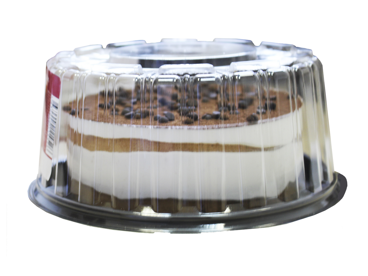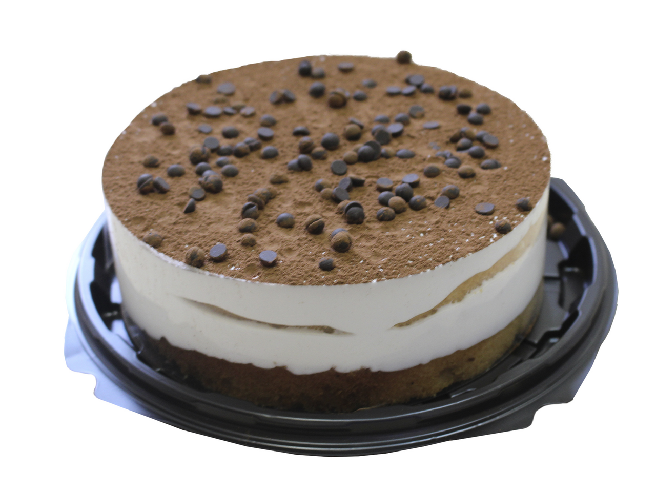 Двашоколадныхбисквитныхкоржапропитаны сахарнымсиропом и прослоены заварным кремом со сливками. Боковая сторонадекорированапленкой.Поверхностьторта украшенакакао-порошком и шоколадными каплями.