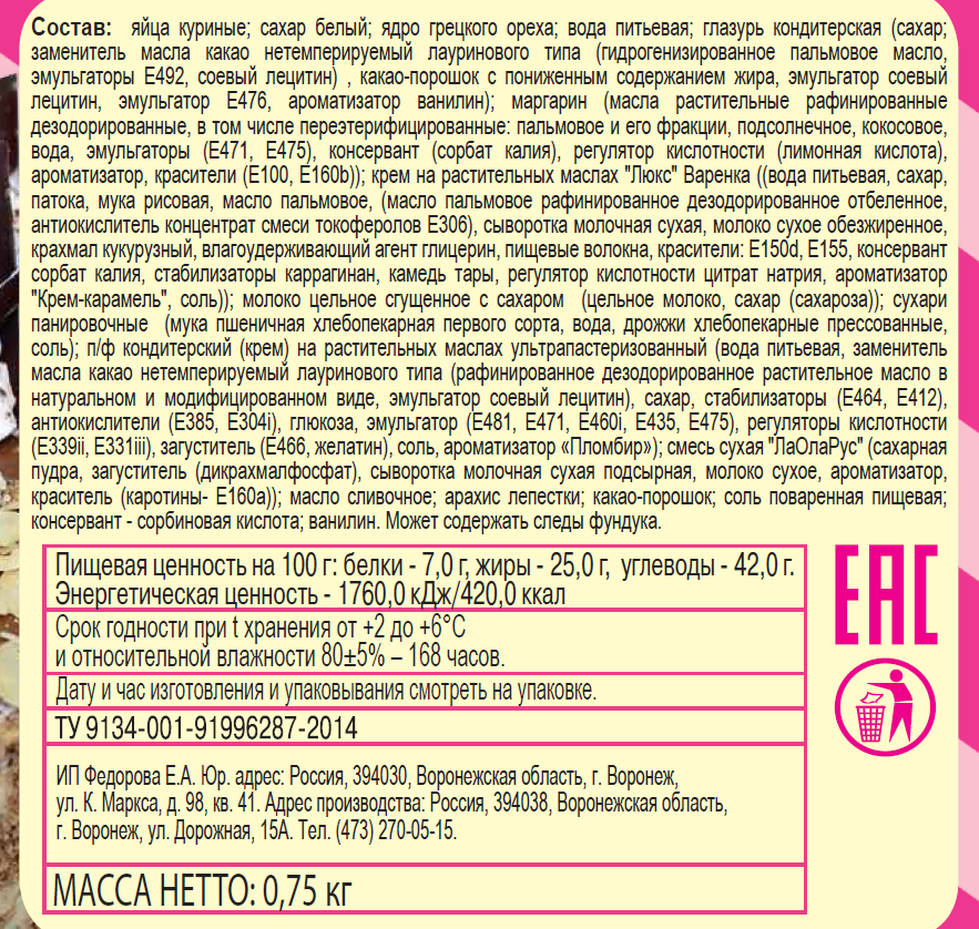 Яйца куриные; сахар белый; ядро грецкого ореха; вода питьевая; глазурь кондитерская сахар; заменитель масла какао нетемного лауринового типа, гидрогенизированное пальмовое масло, эмульгаторы Е492, соевый лецитин , какао-порошок с пониженным содержанием жира, эмульгатор соевый лецитин, эмульгатор Е476, ароматизатор ванилин; маргарин, масла растительные: рафинированные дезодорированные, в том числе переэтерифицированные: пальмовое и его фракции, подсолнечное, кокосовое, вода, эмульгаторы Е471, Е475, консервант сорбат калия, регулятор кислотности лимонная кислота, красители Е100, Е160b; крем на растительных маслах Люкс Варенка, вода питьевая, сахар, патока, мука рисовая, масло пальмовое, антиокислитель концентрат смеси токоферолов Е306, сыворотка молочная сухая, молоко сухое обезжиренное, крахмал кукурузный, влагоудерживающий агент глицерин, пищевые волокна, красители: Е150d, Е155, консервант сорбат калия, стабилизатор каррагинан, камедь тары, регулятор кислотности цитрат натрия, ароматизатор Крем-карамель, соль; молоко цельное сгущеное с сахаром, цельное молоко, сахар, сахароза; сухари панировочные мука пшеничная хлебопекарная первого сорта, вода, дрожжи хлебопекарные прессованные, соль; кондитерский крем на растительных маслах ультрапастеризованный, вода питьевая, заменитель масла какао, эмульгатор соевый лецитин, сахар, стабилизаторы Е464 и Е412, антиокислители Е385 и Е304i, глюкоза, эмульгатор Е481, Е471, Е460i, Е435, Е475, регуляторы кислотности, загуститель Е466, желатин, соль, ароматизатор Пломбир; смесь с Лаоларус, масло сливочное; арахис лепестки; какао-порошок; соль поваренная пищевая; ванилин.