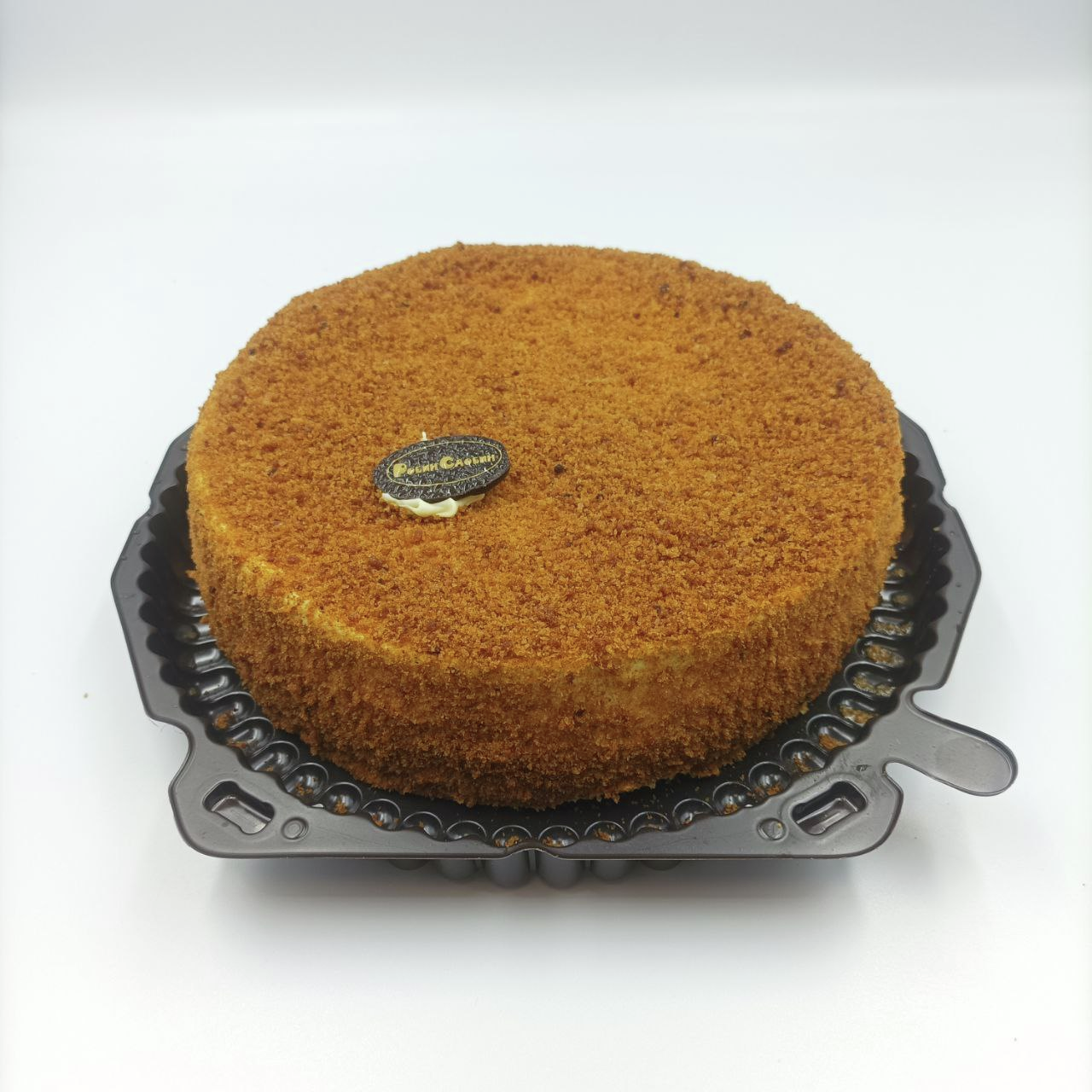 Тонкие медовые коржи, прослоенные заварным кремом и украшенные сверху крошкой из медовых коржей, мягкой карамелью и измельченным грецким орехом. Нежный, воздушный, бархатный медовый бисквит на основе муки высшего сорта с добавлением меда и легкий заварной крем из сливочного масла, меда и сметаны.
