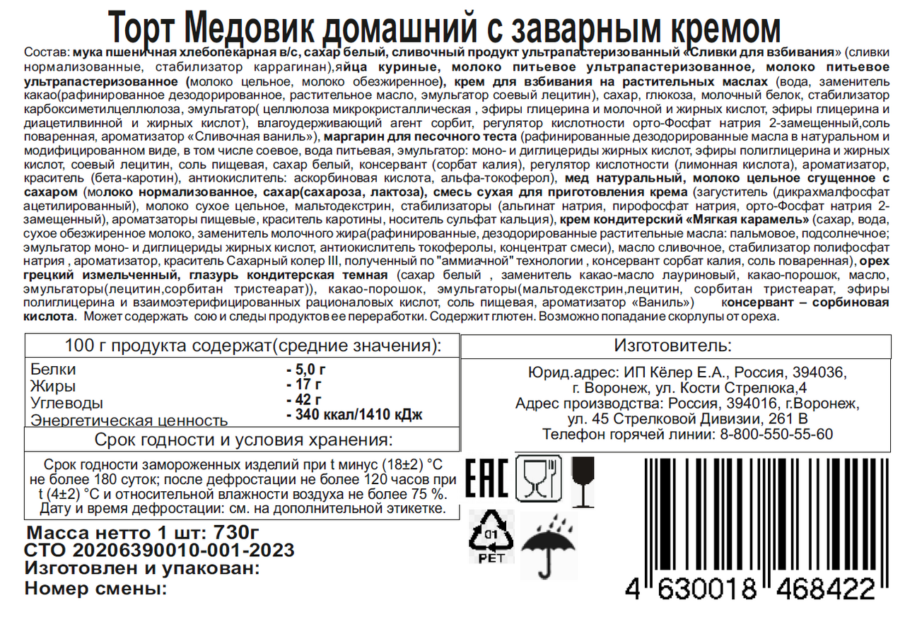 Мука пшеничная хлебопекарная в/с, сахар белый, сливочный продукт ультрапастеризованный Сливки для взбивания (сливки нормализованные, стабилизатор каррагинан), яйца куриные, молоко питьевое ультрапастеризованное, молоко питьевое ультрапастеризованное (молоко цельное, молоко обезжиренное), крем для взбивания на растительных маслах (вода, заменитель какао (рафинированное дезодорированное, растительное масло, эмульгатор соевый лецитин), сахар, глюкоза, молочный белок, стабилизатор карбоксиметилцеллюлоза, эмульгатор( целлюлоза микрокристаллическая, эфиры глицерина и молочной и жирных кислот, эфиры глицерина и диацетилвинной и жирных кислот), влагоудерживающий агент сорбит, регулятор кислотности орто-Фосфат натрия 2-замещенный, соль поваренная, ароматизатор Сливочная ваниль), маргарин для песочного теста (рафинированные дезодорированные масла в натуральном и модифицированном виде, в том числе соевое, вода питьевая, эмульгатор: моно- и диглицериды жирных кислот, эфиры полиглицерина и жирных кислот, соевый лецитин, соль пищевая, сахар белый, консервант (сорбат калия), регулятор кислотности (лимонная кислота), ароматизатор, краситель (бета-каротин), антиокислитель: аскорбиновая кислота, альфа-токоферол), мед натуральный, молоко цельное сгущенное с сахаром (молоко нормализованное, сахар(сахароза, лактоза), смесь сухая для приготовления крема (загуститель (дикрахмалфосфат ацетилированный), молоко сухое цельное, мальтодекстрин, стабилизаторы (альгинат натрия, пирофосфат натрия, орто-Фосфат натрия 2- замещенный), ароматзаторы пищевые, краситель каротины, носитель сульфат кальция), крем кондитерский Мягкая карамель (сахар, вода, сухое обезжиренное молоко, заменитель молочного жира (рафинированные, дезодорированные растительные масла: пальмовое, подсолнечное; эмульгатор моно- и диглицериды жирных кислот, антиокислитель токоферолы, концентрат смеси), масло сливочное, стабилизатор полифосфат натрия, ароматизатор, краситель Сахарный колер III, полученный по "аммиачной" технологии, консервант сорбат калия, соль поваренная), орех грецкий измельченный, глазурь кондитерская темная (сахар белый , заменитель какао-масло лауриновый, какао-порошок, масло, эмульгаторы (лецитин, сорбитан тристеарат)), какао-порошок, эмульгаторы (мальтодекстрин, лецитин, сорбитан тристеарат, эфиры полиглицерина и взаимоэтерифицированных рициноловых кислот, соль пищевая, ароматизатор Ваниль) консервант - сорбиновая кислота.
