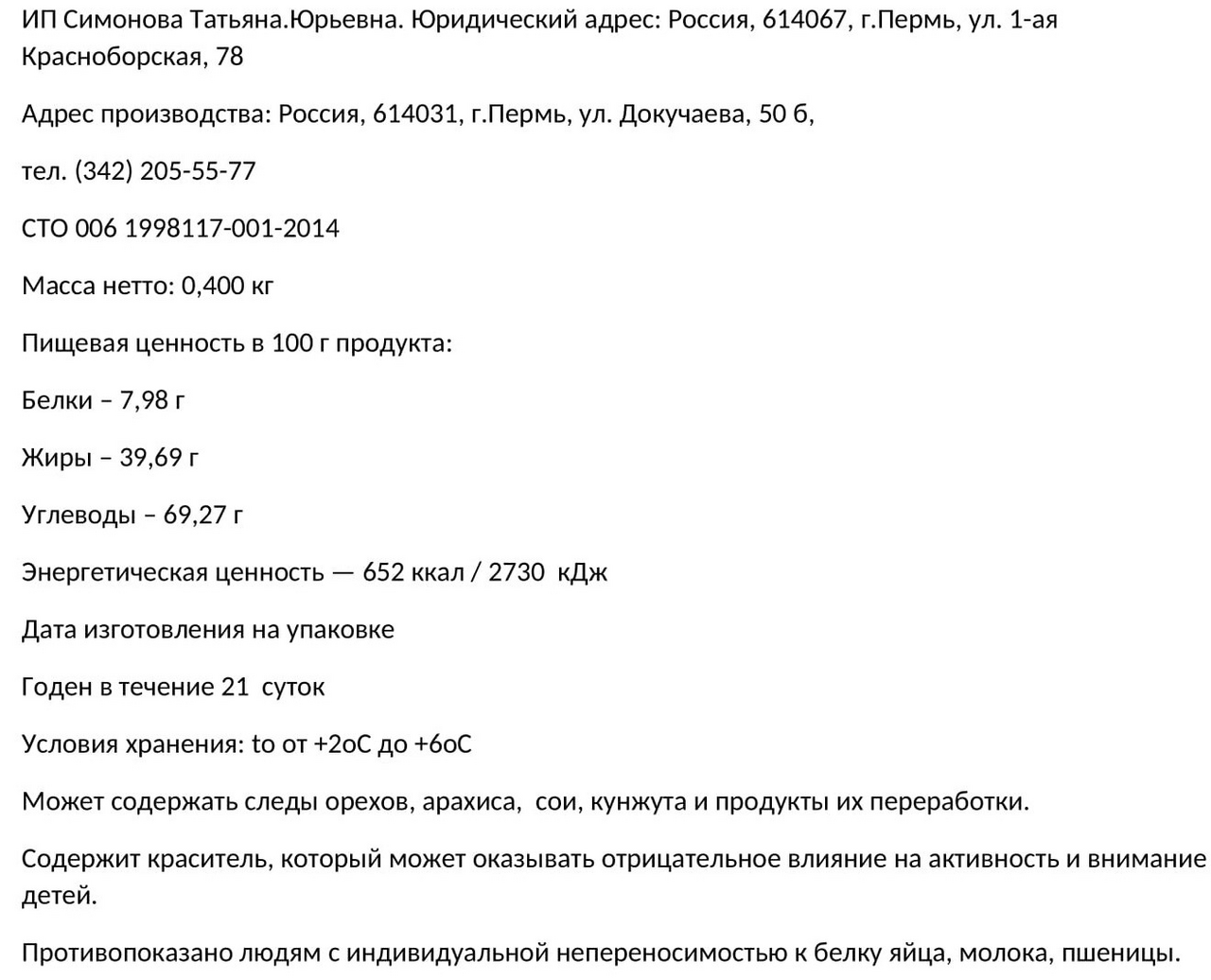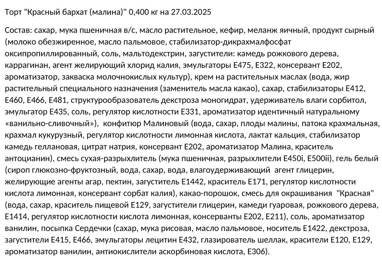 Сахар, мука пшеничная в/с, масло растительное, кефир, меланж яичный, продукт сырный (молоко обезжиренное, масло пальмовое, стабилизатор-дикрахмалфосфат оксипропилированный, соль, мальтодекстрин, загуститель: камедь рожкового дерева, каррагинан, агент желирующий хлорид калия, эмульгаторы Е475, Е322, консервант E202, ароматизатор, закваска молочнокислых культур), крем на растительных маслах (вода, жир растительный специального назначения (заменитель масла какао), сахар, стабилизаторы E412, E460, E466, E481, структурообразователь декстроза моногидрат, удерживатель влаги сорбитол, эмульгатор Е435, соль, регулятор кислотности Е331, ароматизатор идентичный натуральному ванильно-сливочный), конфитюр Малиновый (вода, сахар, плоды малины, патока крахмальная, крахмал кукурузный, регулятор кислотности лимонная кислота, лактат кальция, стабилизатор камедь геллановая, цитрат натрия, консервант Е202, ароматизатор Малина, краситель антоцианин), смесь сухая-разрыхлитель (мука пшеничная, разрыхлитель E450i, E500ii), гель белый (сироп глюкозно-фруктозный, вода, сахар, вода, влагоудерживающий агент глицерин, желирующие агенты агар, пектин, загуститель Е1442, краситель Е171, регулятор кислотности кислота лимонная, консервант сорбат калия), какао-порошок, смесь для окрашивания "Красная" (вода, сахар, краситель пищевой Е129, загустители глицерин, камеди гуаровая, рожкового дерева, E1414, регулятор кислотности кислота лимонная, консерванты E202, E211), соль, ароматизатор ванилин, посыпка Сердечки (сахар, мука рисовая, масло пальмовое, носитель Е1422, декстроза, загуститель E415, E466, эмульгаторы лецитин Е432, глазирователь шеллак, красители E120, E129, ароматизатор ванилин, антиокислители аскорбиновая кислота, E306).