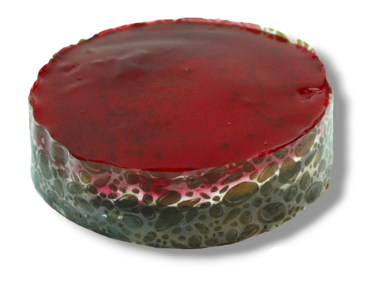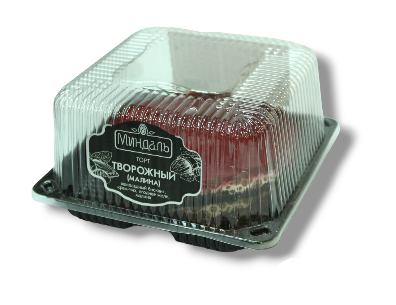 Торт из шоколадного бисквита с нежным кремом из творожного сыра Креметте, покрыт желе с ягодами малины.