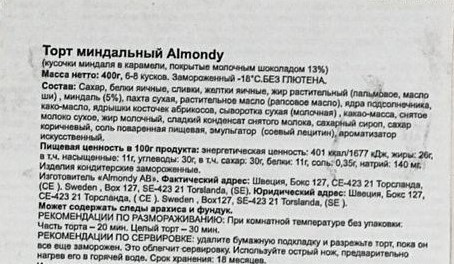 Торт Almondy миндальный замороженный, 400г