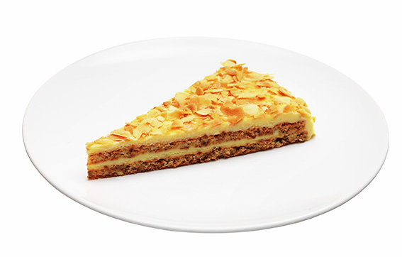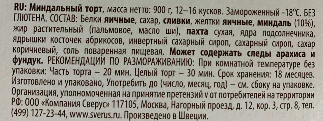 Миндальный торт бренда Almondy изготовлен по традиционному рецепту, максимально приближенному к оригинальному. В составе отсутствует пшеничная мука, поэтому продукт не содержит глютена и его можно употреблять даже при диетическом питании. Бисквитные коржи пропитаны и покрыты нежным сливочным кремом, благодаря чему лакомство приобретает плотность и насыщенность. Для его украшения используются миндальные лепестки. Перед подачей на стол торт необходимо разморозить.
