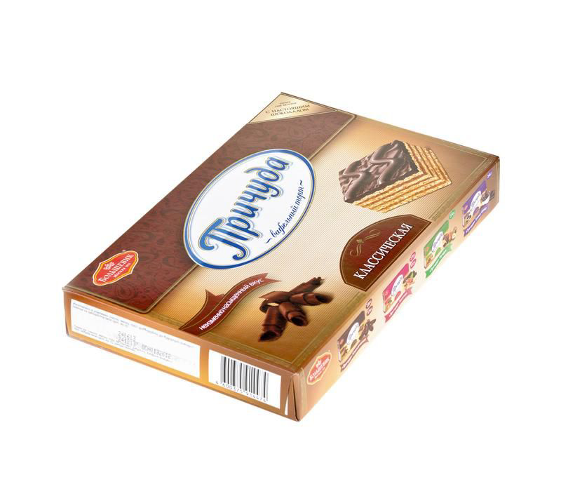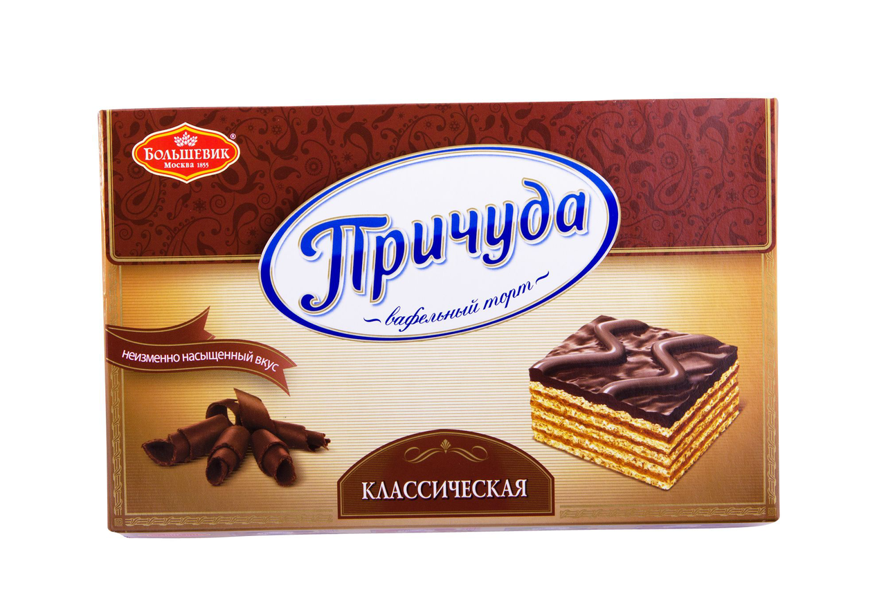 Торт вафельный глазированный Причуда Классическая с арахисовой начинкой, 370 г. Состав: сахар, мука пшеничная, глазурь кондитерская (сахар, заменитель масла какао, какао-порошок, эмульгаторы (лецитин соевый, Е476), ароматизатор ''ванильный'' идентичный натуральному), масло кокосовое, арахис обжаренный дробленый, какао-порошок, сухая молочная сыворотка, эмульгатор (лецитин соевый), масло подсолнечное, крахмал кукурузный, разрыхлитель (гидрокарбонат натрия), соль поваренная пищевая, регулятор кислотности (кислота лимонная), добавка, препятствующая слеживанию и комкованию (Е504). Пищевая ценность: белки 8,1 г, жиры 29,3 г, углеводы 54,8 г. Энергетическая ценность: 516 ккал. Хранить в сухом, прохладном месте. Срок годности: 6 месяцев.
