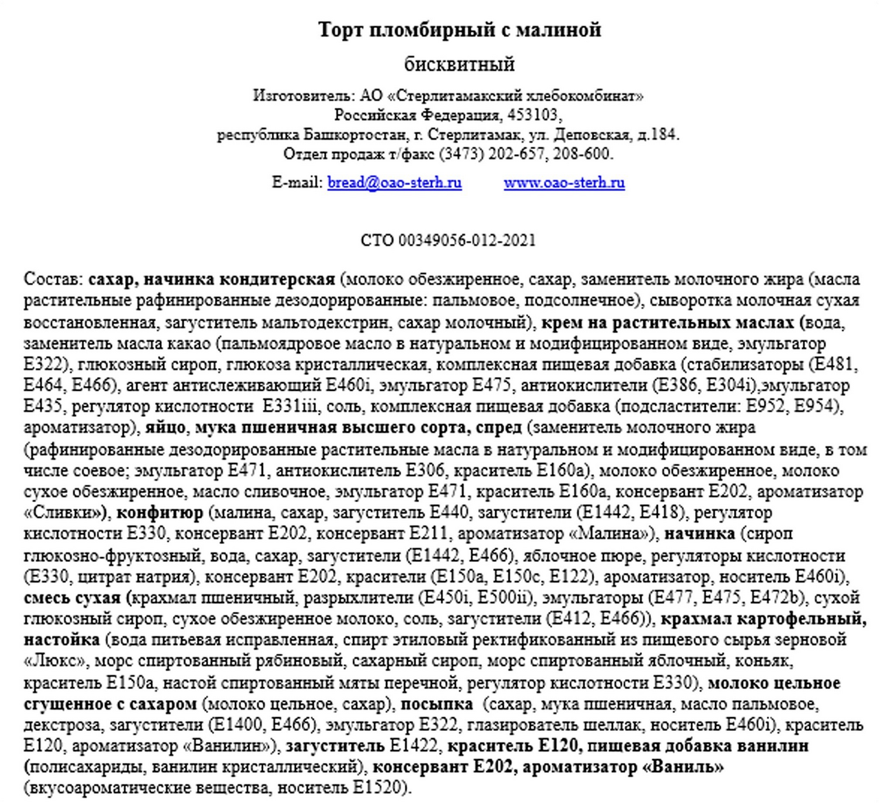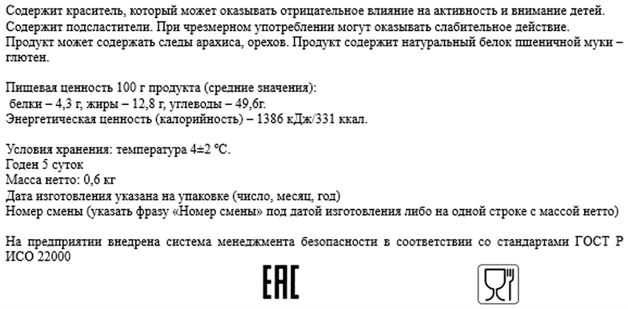 Сахар, начинка кондитерская молоко обезжиренное, сахар, заменитель молочного жира масла растительные рафинированные дезодорированные пальмовое, подсолнечное, сыворотка молочная сухая восстановленная, загуститель мальтодекстрин, сахар молочный, крем на растительных маслах вода, заменитель масла какао пальмоядровое масло в натуральном и модифицированном виде, эмульгатор Е322, глюкозный сироп, глюкоза кристаллическая, комплексная пищевая добавка стабилизаторы Е466, Е481, Е464, агент антислеживающий Е460i, эмульгатор Е475, антиокислители Е386, Е304i, эмульгатор Е435, регулятор кислотности Е331iii, соль, комплексная пищевая добавка подсластители Е952, Е954, ароматизатор, яйцо, мука пшеничная высшего сорта, спред растительно-жировой заменитель молочного жира рафинированные дезодорированные растительные масла в натуральном и модифицированном виде, в том числе соевое, эмульгатор Е471, антиокислитель Е306, краситель Е160а, молоко обезжиренное, молоко сухое обезжиренное, масло сливочное, эмульгатор Е471, краситель Е160а, консервант Е202, ароматизатор Сливки, конфитюр малина, сахар, загуститель Е440, загустители Е1442, Е418, регулятор кислотности Е330, консервант Е202, консервант Е211, ароматизатор Малина, начинка сироп глюкозно-фруктозный, вода, сахар, загустители Е1442, Е466, яблочное пюре, регуляторы кислотности Е330, цитрат натрия, консервант Е202, красители Е150а, Е150с, Е122, ароматизатор, носитель Е460i.