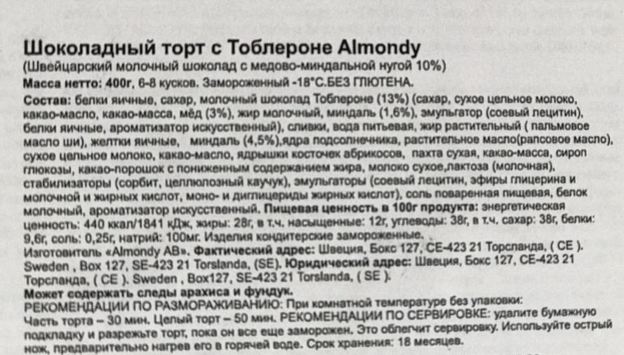 Белки яичные, сахар, молочный шоколад Тоблероне (13%) (сахар, сухое цельное молоко, какао-масло, какао-масса, мед (3%), жир молочный , миндаль (1,6%), эмульгатор (соевый лецитин), белки яичные, ароматизатор искусственный, сливки, вода питьевая, жир растительный (пальмовое, рапсовое масло, масло ши), желтки яичные, миндаль (4,5%), ядра подсолнечника, растительное масло (рапсовое масло), сухое цельное молоко, какао-масло, ядрышки косточек абрикосов, пахта сухая, какао-масса, сироп глюкозы, какао-порошок с пониженным содержанием жира, молоко сухое, лактоза (молочная), cтабилизаторы (сорбит, целлюлозный каучук), эмульгатор (соевый лецитин, моно и диглицериды эфиров молочной кислоты, моно и диглицериды жирных кислот), соль поваренная пищевая, белок молочный, ароматизатор искусственный. Может содержать следы арахиса и фундук