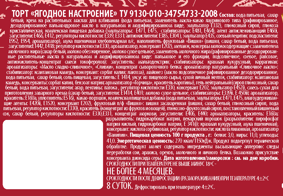 Вода питьевая, сахар белый, крем на растительных маслах для взбивания (вода питьевая, заменитель масла какао лауринового типа (рафинированное дезодорированное пальмоядровое масло в натуральном и модифицированном виде, эмульгатор е332), глюкозный сироп, глюкоза кристаллическая, комплексная пищевая добавка (эмульгаторы: е471, е475, стабилизаторы: е481, е464, агент антислеживающий е460i, загустители: е466, е412, регуляторы кислотности: е339, е331, антиокислители: е385, е304), эмульгатор е435, соевый лецитин, подсластители: е952, е954, ароматизатор), мука пшеничная хлебопекарная высший сорт, наполнитель фруктовый вишня (вишня, сахар белый, вода питьевая, загустители е1442, е418, регулятор кислотности е330, ароматизатор, консервант е202), меланж, консервы молокосодержащие с заменителем молочного жира (сахар белый, молоко обезжиренное, молоко сухое цельное, заменитель молочного жира (рафинированные дезодорированные растительные масла в натуральном и модифицированном виде: пальмовое и его фракции, подсолнечное, соевое, рапсовое, антиокислитель - концентрат смеси токоферолов), загуститель мальтодекстрин, стабилизаторы: крахмал кукурузный, каррагинан, ароматизаторы: масло сладкосливочное, сливки, концентрат сывороточного белка, ароматизатор натуральный сливочное масло, стабилизатор ксантановая камедь, консервант сорбат калия, лактоза), майонез (масло подсолнечное рафинированное дезодорированное, вода питьевая, сахар белый, соль пищевая, загуститель е1414, уксус из пищевого сырья, сухой яичный желток, стабилизатор: ксантановая камедь, консерванты: сорбат калия, бензоат натрия, ароматизатор горчица, краситель каротины), гель нейтральный (сироп глюкозный, сахар белый, вода питьевая, загустители: агар, пектины, патока, регулятор кислотности е330, консервант е202, фруктовый полуфабрикат вишня: вишня засахаренная (вишня, сахар белый, глюкозный сироп, вода питьевая, регулятор кислотности е330), краситель (концентрат из фруктов и овощей), глюкозно-фруктозный сироп, восстановленный вишнёвый сок, сахар белый, регуляторы кислотности: е330, е331, концентрат моркови, загустители: е406, е440, ароматизаторы, краситель е160а, разрыхлитель гидрокарбонат натрия е341 (i), крахмал кукурузный, мука пшеничная), консервант кислота сорбиновая, регулятор кислотности кислота лимонная, ароматизатор ванилин.