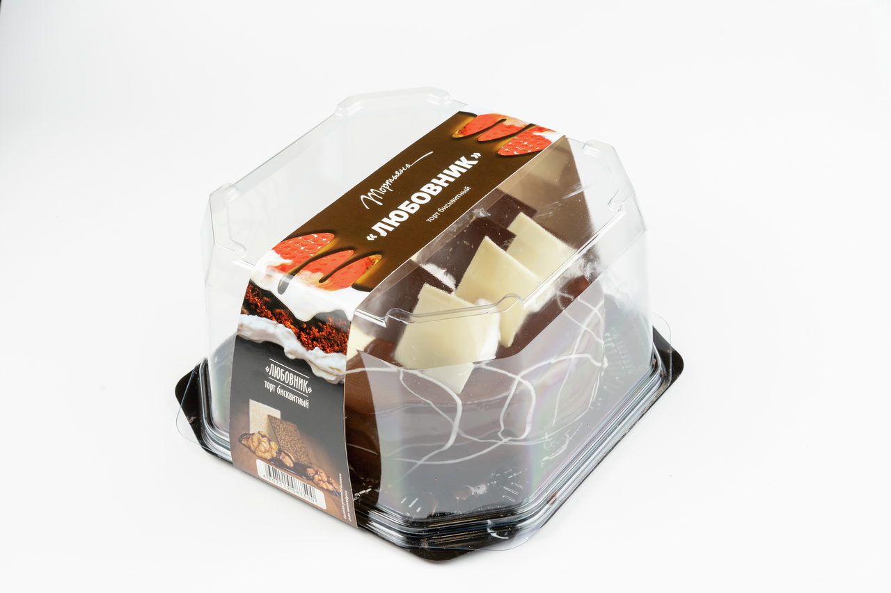 Ванильный и шоколадный бисквит прослоен сиропом, прослойка карамельная с грецкими орехами, сметанный крем. Торт украшен шоколадной глазурью и шоколадом.