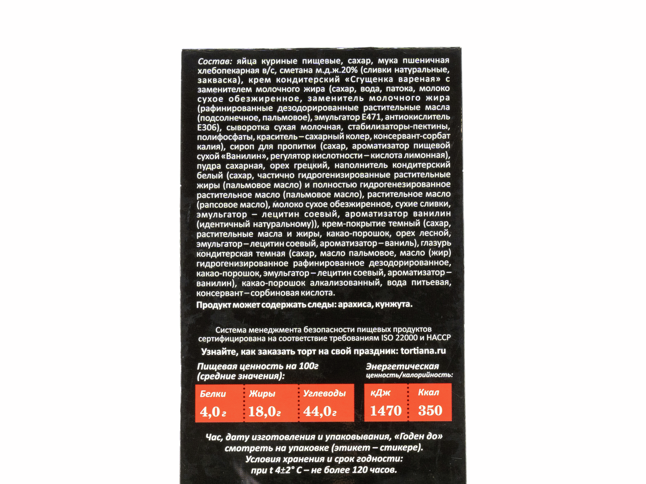Яйца куриные пищевые, сахар, мука пшеничная хлебопекарная высший сорт, сметана м. д. ж. 20% (сливки натуральные, закваска), крем кондитерский Сгущёнка варёная с заменителем молочного жира (сахар, вода, патока, молоко сухое обезжиренное, заменитель молочного жира (рафинированные дезодорированные растительные масла (подсолнечное, пальмовое), эмульгатор Е471, антиокислитель Е306), сыворотка молочная сухая, стабилизаторы - пектины, полифосфаты, краситель - сахарный колер, консервант - сорбат калия), сироп для пропитки (сахар, ароматизатор пищевой сухой Ванилин, регулятор кислотности - лимонная кислота), крем растительно-жировой для взбивания с заменителем молочного жира (вода, заменитель молочного жира (смесь дезодорированных растительных масел (подсолнечное, пальмовое), эмульгатор Е471, антиокислитель Е306), молоко сухое обезжиренное, сахар, глюкоза кристаллическая, стабилизатор - Е466), пудра сахарная, орех грецкий, наполнитель кондитерский белый (сахар, частично гидрогенизированные растительные жиры (пальмовое масло) и полностью гидрогенизированное растительное масло (пальмовое масло), растительное масло (рапсовое масло), молоко сухое обезжиренное, сухие сливки, эмульгатор - лецитин соевый, ароматизатор ванилин (идентичный натуральному)), крем-покрытие тёмный (сахар, растительные масла и жиры, какао-порошок, орех лесной, эмульгатор - лецитин соевый, ароматизатор - ваниль), глазурь кондитерская тёмная (сахар, масло пальмовое, масло (жир) пальмовое гидрогенизированное рафинированное дезодорированное, какао-порошок, эмульгатор - лецитин соевый, соль, ароматизатор - ванилин), какао-порошок алкализованный, вода питьевая, консервант - сорбиновая кислота.