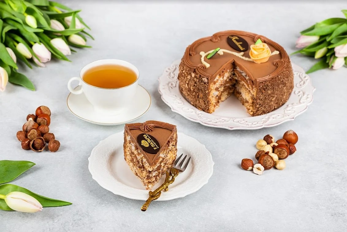 Три слоя воздушно-ореховых коржа из мелко дробленого ореха, яичного белка, сахара и муки. Прослоены сливочно-заварным шоколадным кремом с добавлением коньяка. Торт покрыт сливочно-заварным шоколадным кремом, украшен веточкой с розой из сливочного крема, боковые стороны украшены шоколадной крошкой.