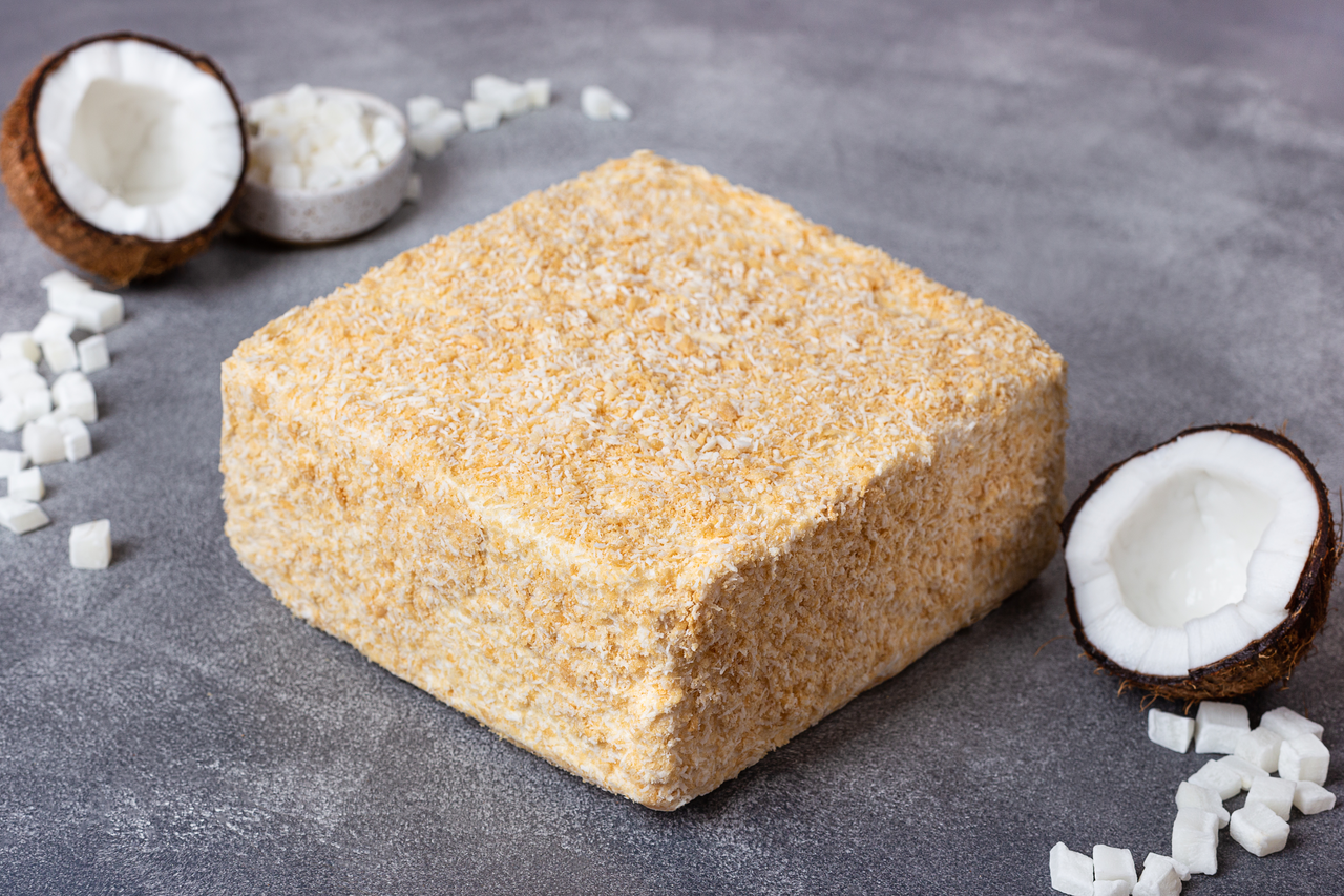 Без содержания животных компонентов и с тонким экзотическим ароматом натурального кокоса. 12 тонких и нежных слоеных коржей на настоящем кокосовом масле из Малайзии, без заменителей и добавок. Вкуснейший заварной крем на натуральном кокосовом молоке из Тайланда и ароматная кокосовая стружка в декоре торта. Без растительных сливок и пальмового масла. Только полезные жиры и ценное кокосовое молоко. Можно в пост.