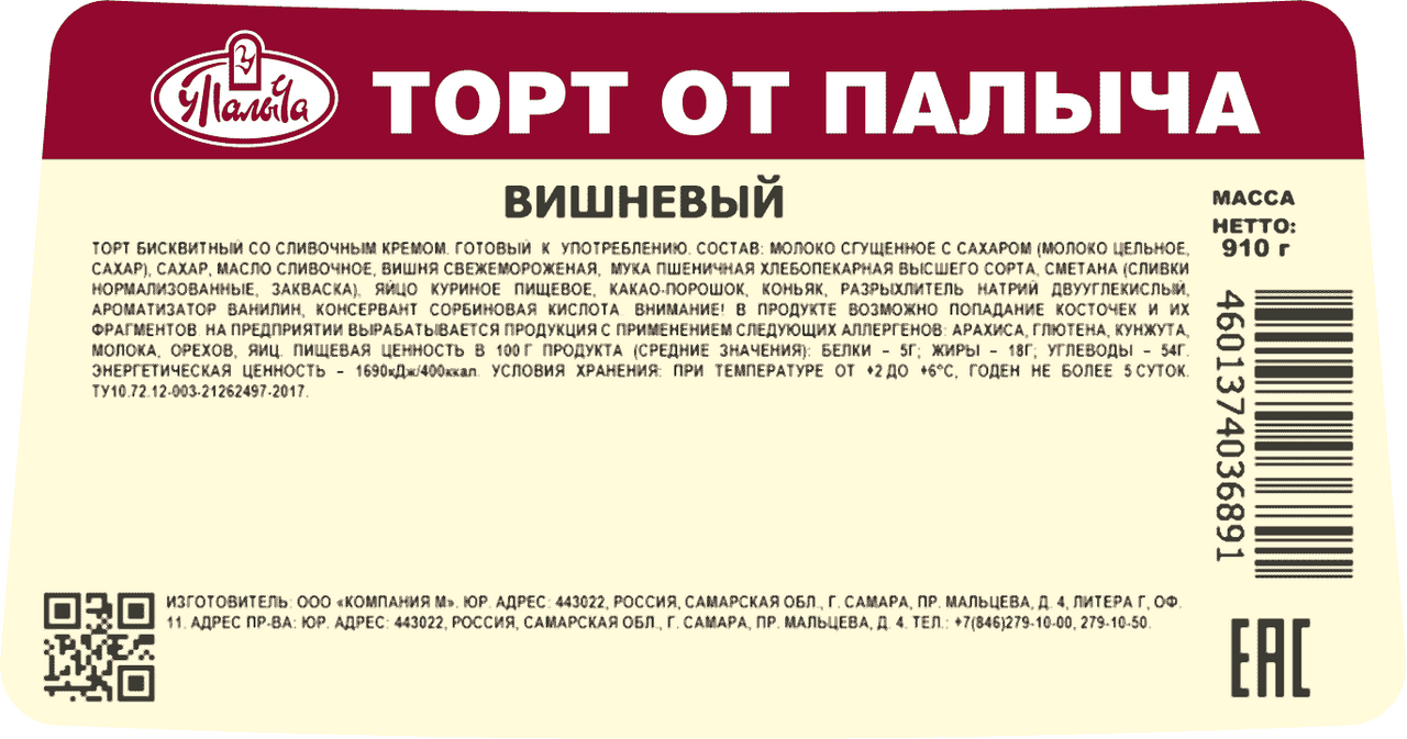 Молоко сгущенное с сахаром (молоко цельное, сахар, масло сливочное, вишня свежемороженая, мука пшеничная хлебопекарная высшего сорта сметана (сливки нормализованные, закваска), яйцо куриное пищевое, какао-порошок, коньяк, разрыхлитель натрий двууглекислый, ароматизатор ванилин, консервант сорбиновая кислота.