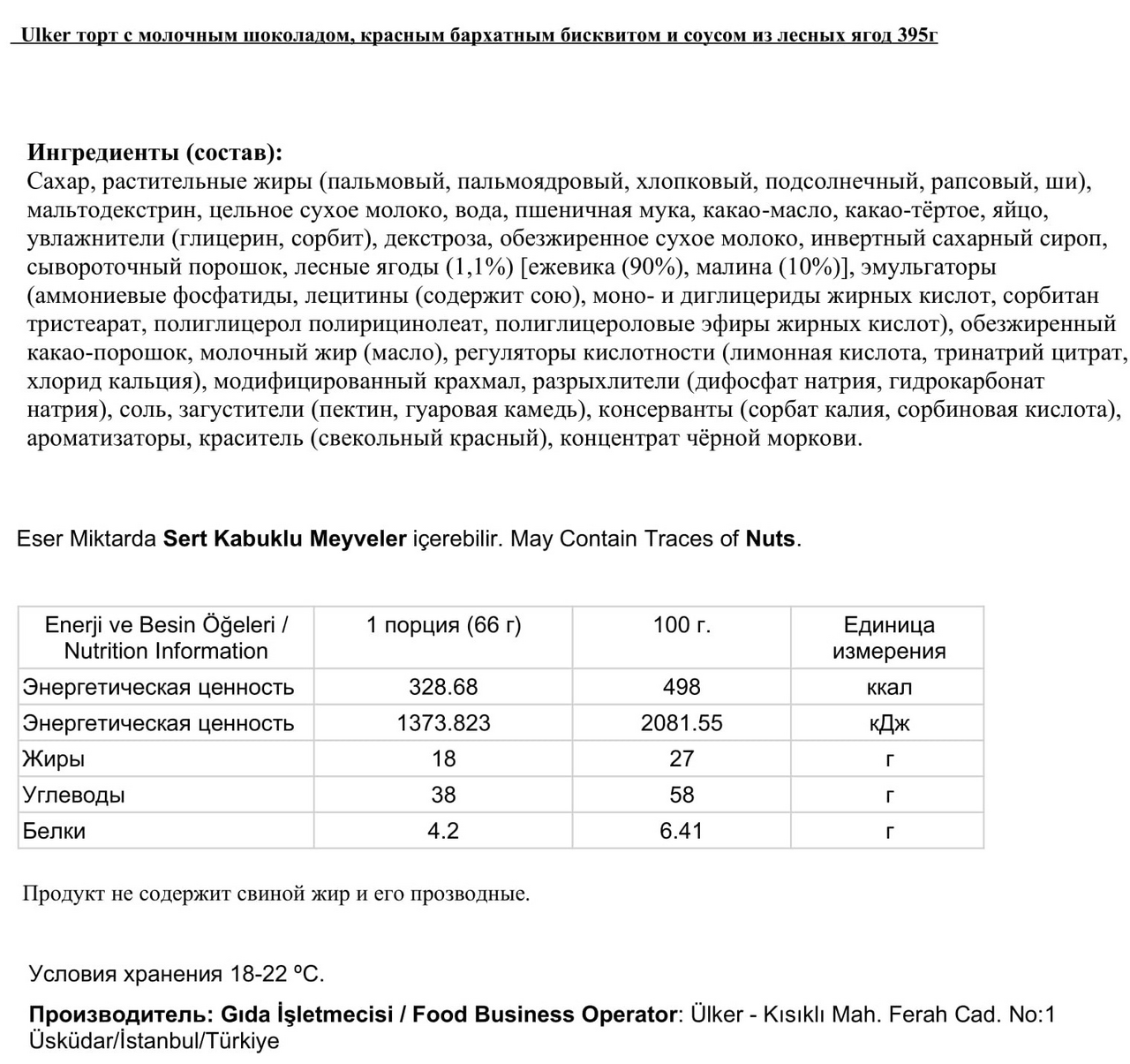 Торт Ulker шоколадный с начинкой из лесных ягод и сливочного крема, 395г