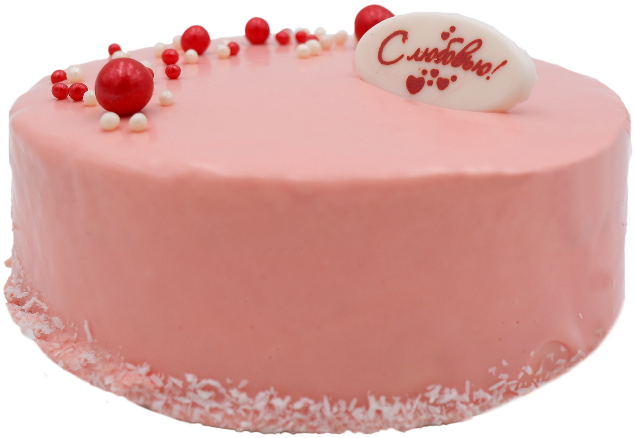торт на основе классического бисквита Красный бархат, пропитан сахарным сиропом, прослоен сырным кремом Чиз с добавлением клубничного конфитюра. Сверху покрыт клубничной шоколадной пастой. Декорирован разноцветной вафельной посыпкой, светлой шоколадной глазурью и кокосовой стружкой.