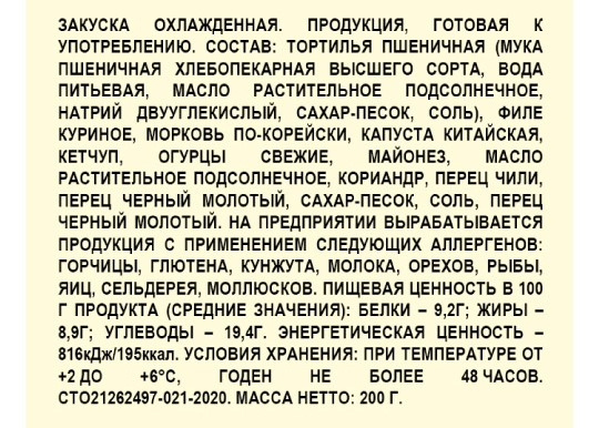 Тортилья пшеничная (мука пшеничная хлебопекарная высшего сорта, вода питьевая, масло растительное подсолнечное, натрий двууглекислый, сахар-песок, соль поваренная пищевая), филе куриное, морковь по-корейски, капуста китайская, кетчуп, огурцы свежие, майонез, масло растительное подсолнечное, кориандр, перец чили, перец черный молотый, сахар-песок, соль поваренная пищевая.