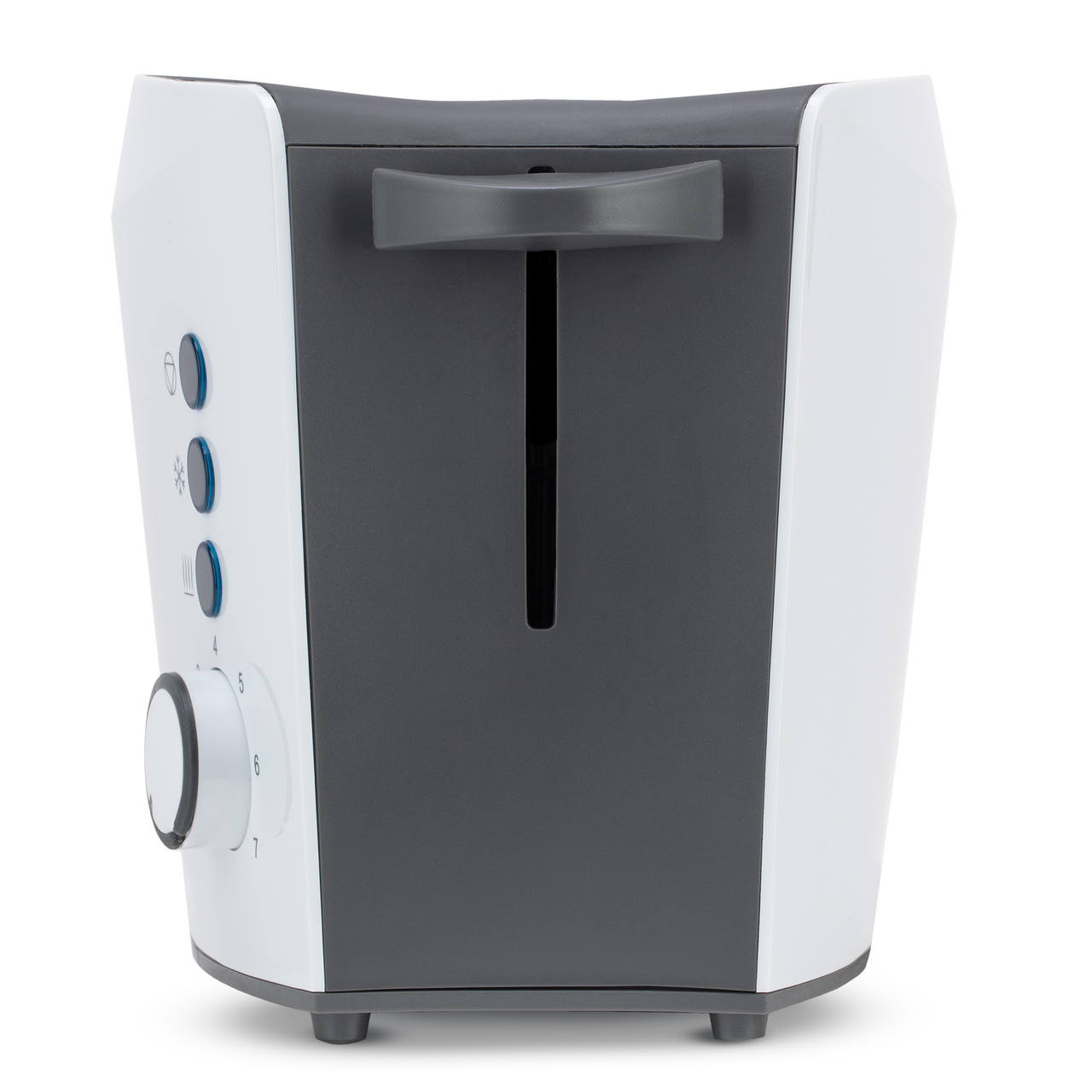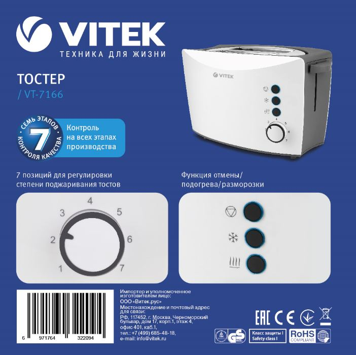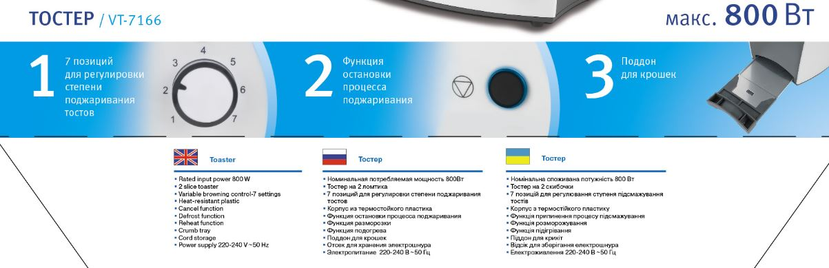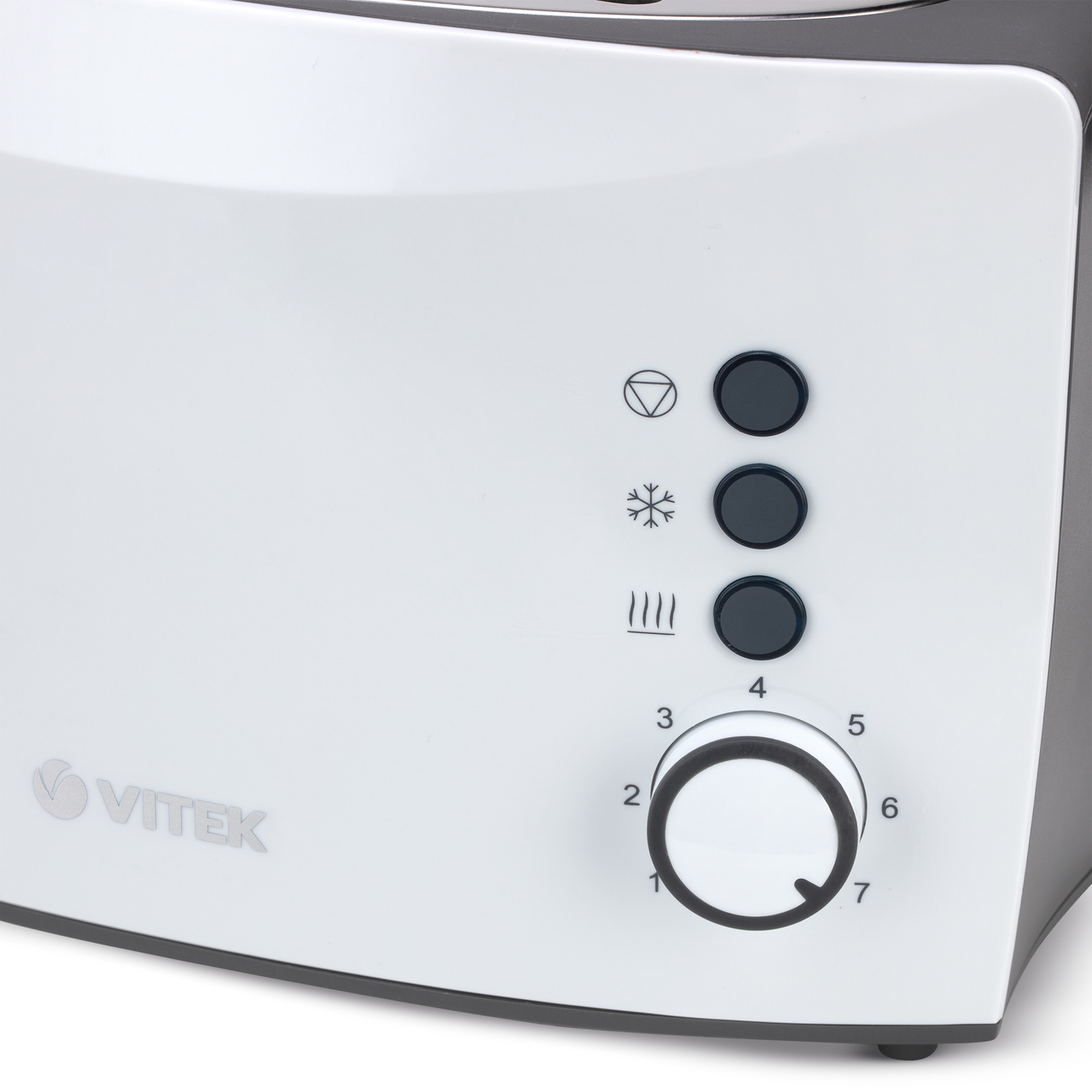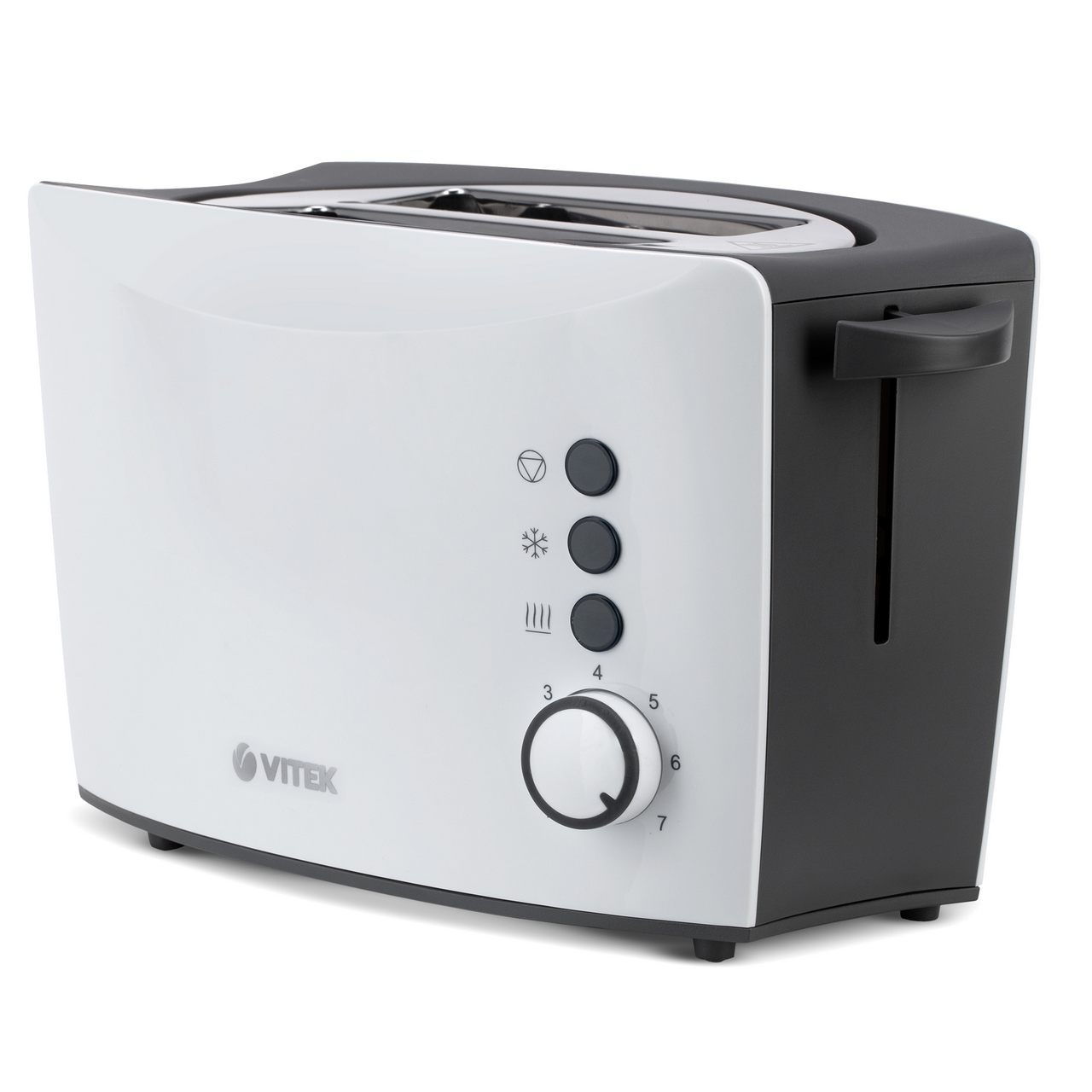 Подрумянить ломтики хлеба до необходимой вам степени способен тостер Vitek VT-7166: вы можете выбрать любой из семи уровней прожарки, предусмотренных в устройстве. Пользоваться им легко и удобно, благодаря простому механическому управлению (специальная кнопка позволяет мгновенно остановить процесс приготовления). Кстати вы можете не только выбирать степень прожарки хлеба, но также просто разогревать его или размораживать - с помощью специально предусмотренных для этого режимов.