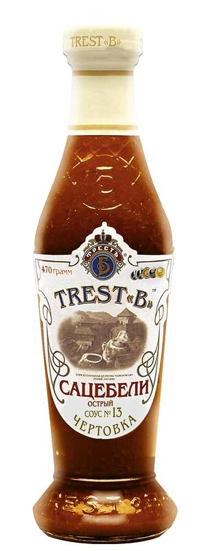 Соус Trest B Сацебели Чертовка №13 Острый, 470г - острый соус, с ярко выраженным характером и букетом грузинских пряных трав и ароматных специй. Незаменим при приготовлении баранины, а также идеально подходит к шашлыку, птице и жареным овощам.Может использоваться, как с любыми горячими и холодными блюдами, так и в качестве добавок в супы и салаты.