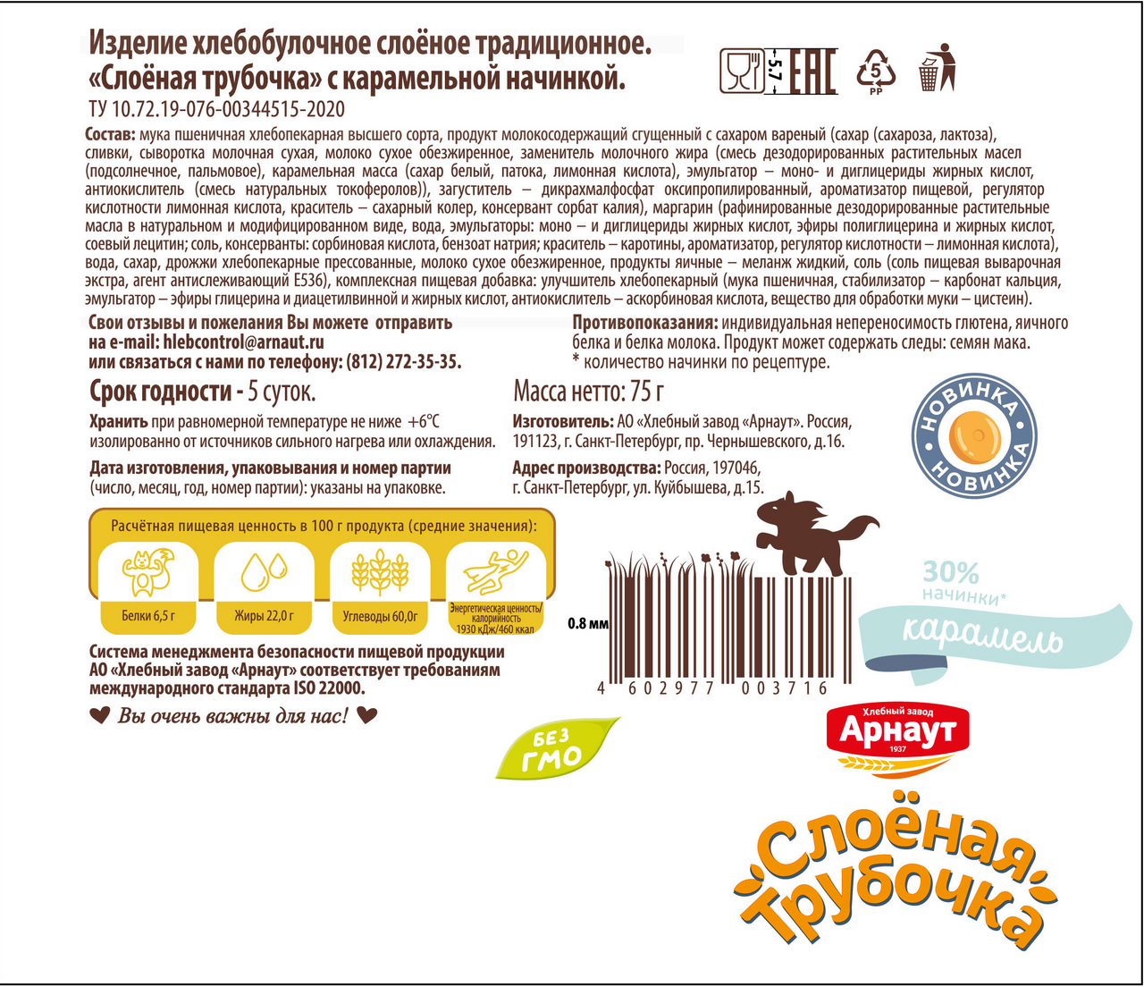 Слоеное хлебобулочное изделие, изготовленное на длительной опаре, из-за чего изделие получается воздушным и пушистым. С карамельной начинкой, распределенной по всей длине изделия, напоминающей вкус детства. Свежая, пышная, аппетитная слойка идеально подходит для семейного завтрака или перекуса в течение дня.