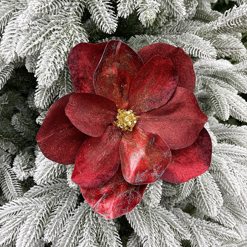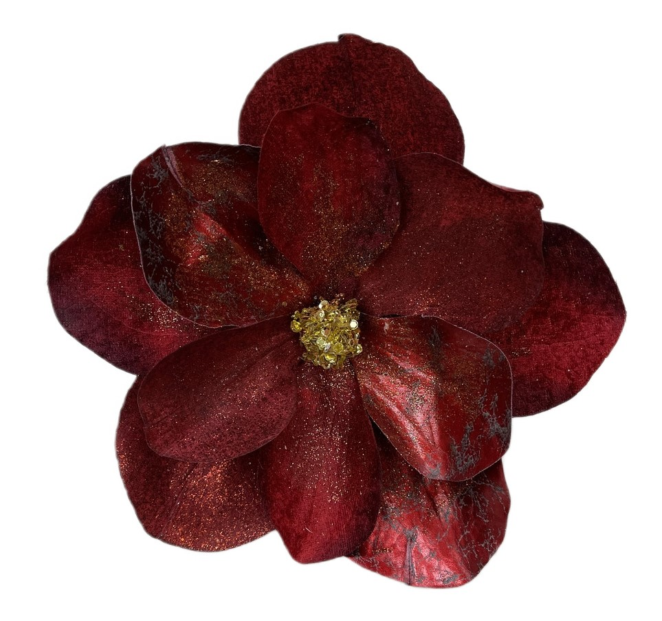 Цветок магнолия на клипсе с золотой серединой бордовый, 20см - декоративный цветок на модной клипсе. Магнолия выполнена из бархатистого текстиля покрытого декоративными блестками. Длинные ножки цветков позволяют не только украсить ими елку, но и поставить цветы в вазу. Можно украсить ими и хвойной гирляндой каминную полку.