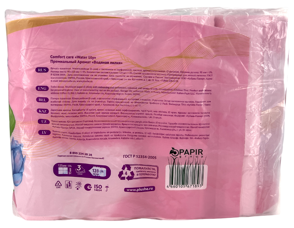 Трехслойная туалетная бумага поразит невероятной мягкостью, но при этом отличается необходимой прочностью. Она обладает приятным ароматом водяной лилии. Все это делает гигиеническое средство Comfort care от бренда Plushe отличным выбором для всех членов семьи.