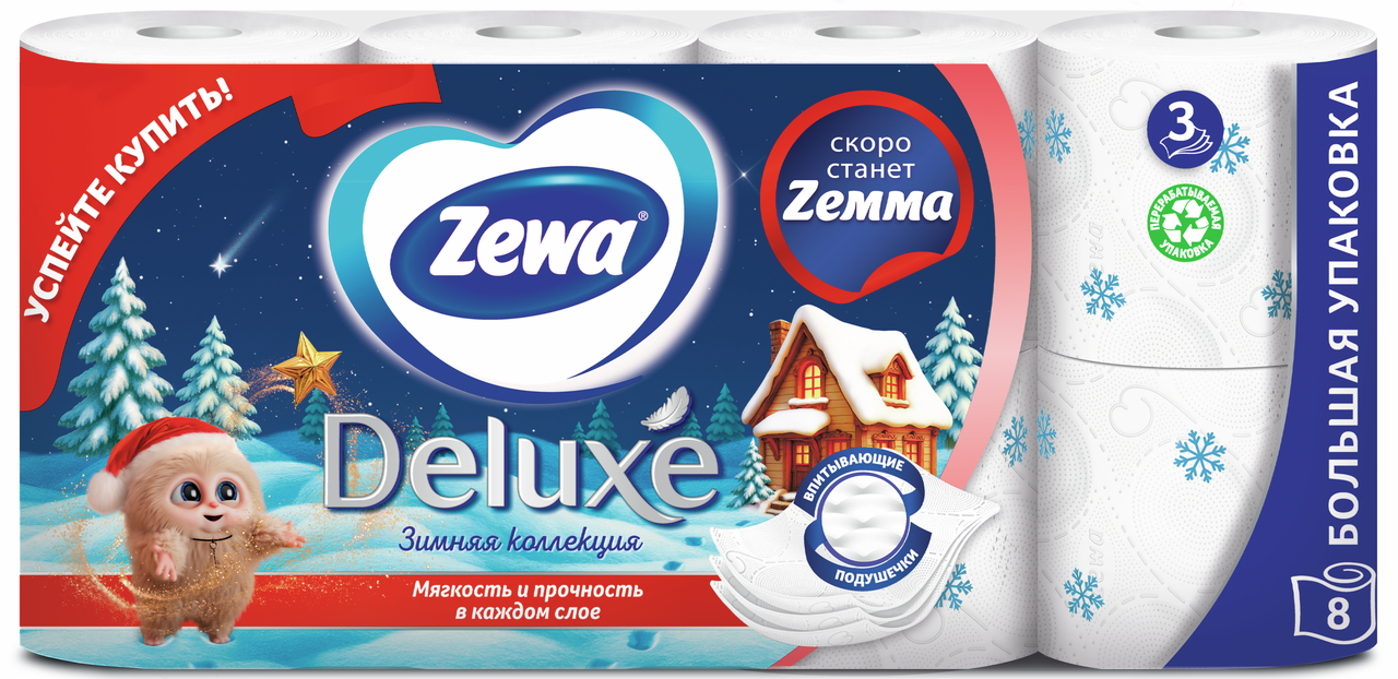 Туалетная бумага Zewa Deluxe 3-слойная, 8 рулонов