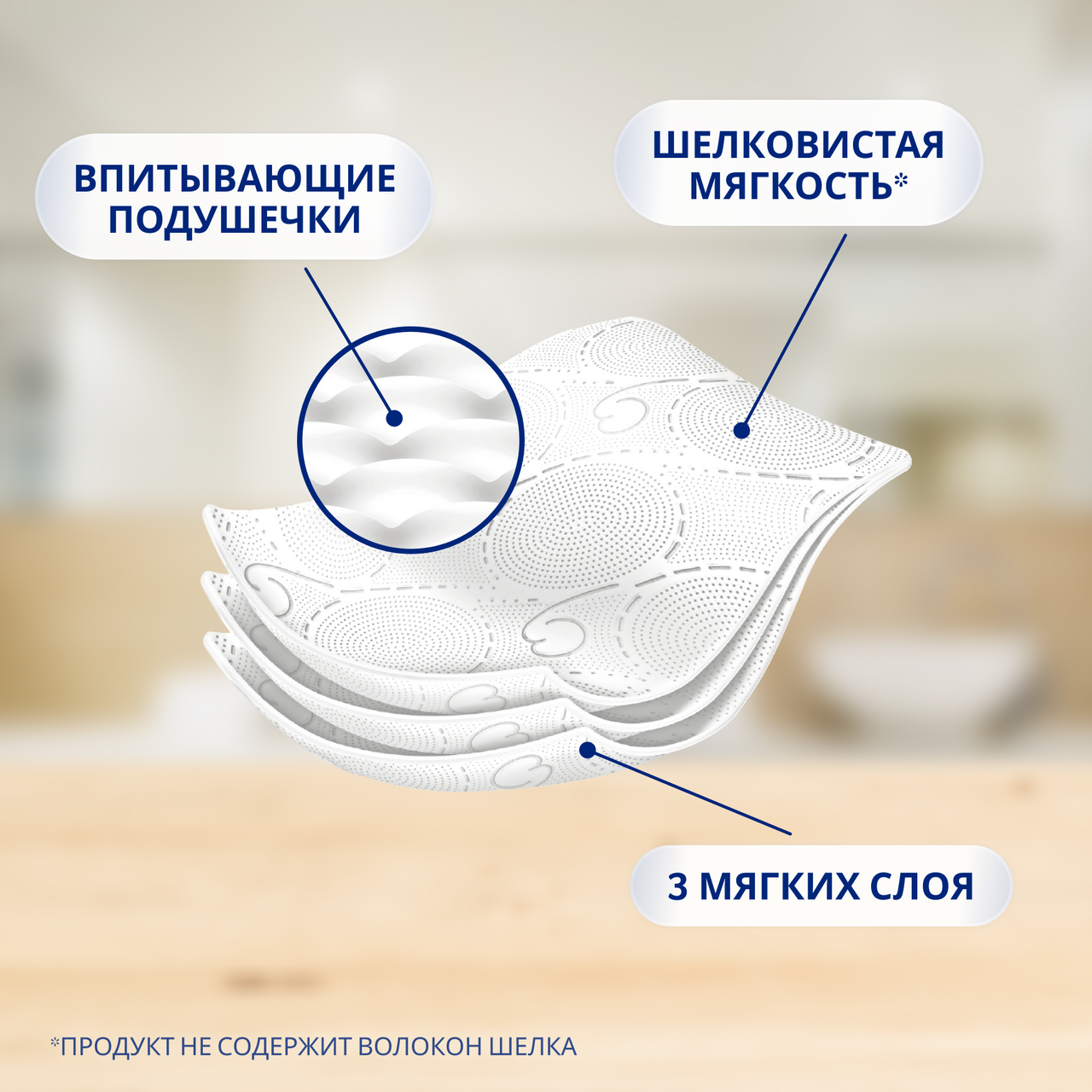 Впитывающие подушечки, созданные по особой технологии, обеспечивают деликатное очищение. Удовольствие и Комфорт – вашей коже это понравится! Белая 3-х слойная туалетная бумага без аромата. Роскошная туалетная бумага с впитывающими подушечками. Шелковистая мягкость для вашей нежной кожи.