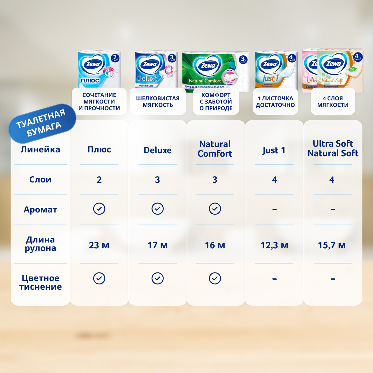 Попробуйте шелковистую мягкость туалетной бумаги Zewa Deluxe. Впитывающие подушечки, созданные по особой технологии, обеспечивают деликатное очищение. Удовольствие и Комфорт – вашей коже это понравится!