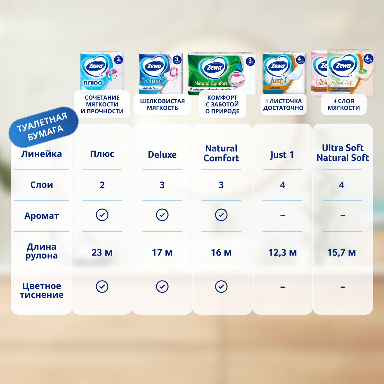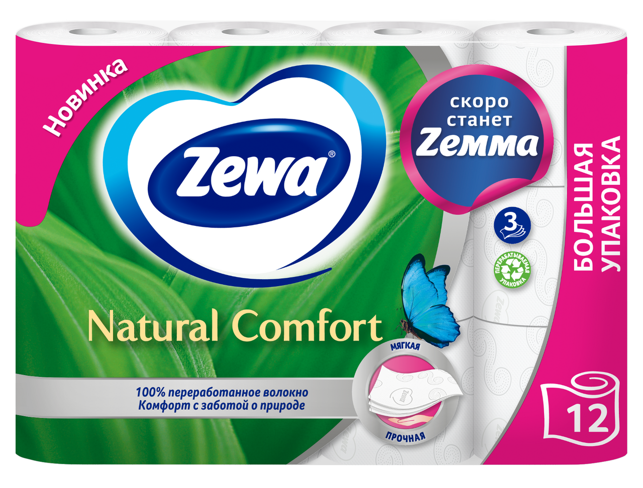 Попробуйте новинку - мягкую и прочную Zewa Natural Comfort из 100% переработанного волокна. Туалетная бумага Zewa Natural Comfort является осознанным выбором для заботы о себе и природе. Эта бумага изготовлена из 100% переработанных волокон, а значит, для ее производства не были вырублены дополнительные деревья. Благодаря современным технологиям производства туалетная бумага Zewa Natural Comfort – мягкая, прочная и впитывающая.