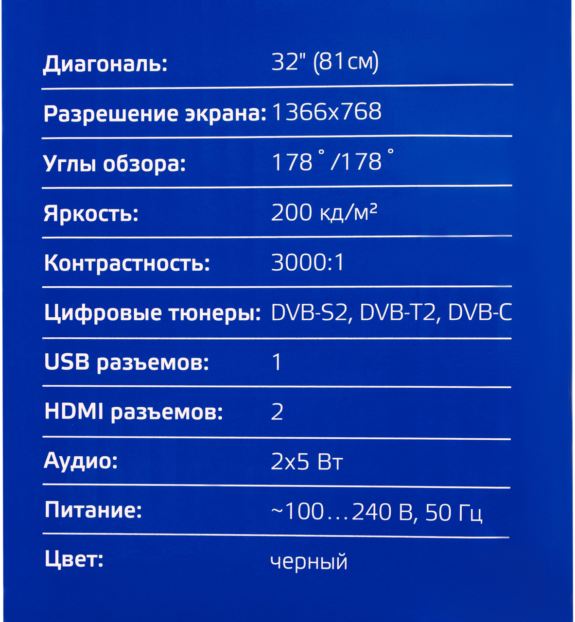 Телевизор Hyundai H-Led32BT4100 Frameless — 32-дюймовая модель с разрешением 1366 х 768 пикселей (стандарт HD Ready). Для комфортного просмотра мультимедийного контента и игр дисплей с соотношением сторон 16:9 представляет частоту обновления 60 Гц. Углы обзора достигают 178 по вертикали и горизонтали. Детализированная картинка характеризуется хорошей цветопередачей и контрастностью. Она одинаково хорошо воспринимается под разными углами. Для качественного приема ТВ-сигнала в телевизоре реализованы три тюнера. Они работают в цифровом, кабельном и спутниковом диапазонах. Объемный звук проигрывается с помощью двух стереодинамиков мощностью 5 Вт и поддержкой Surround Sound. Модель обладает ультратонким дизайном, который органично вписывается в современные стили интерьера: от хай-тек до лофта. Прочный корпус в черном цвете адаптирован для подвешивания на стене с помощью крепления VESA. Интерфейсы в девайсе представлены двумя портами HDMI, двумя антеннами, выходом S/PDIF, AV, USB 2.0 и Common Slot. Здесь также предусмотрены телетекст, опция родительский контроль, таймер сна и функция Time Shift. Она позволяет приостановить просмотр телевизионной программы в реальном времени и возвращаться к ней позже. Time Shift полезен в случае пря��ых трансляций спортивных событий или других важных мероприятий.