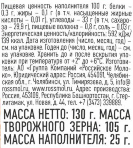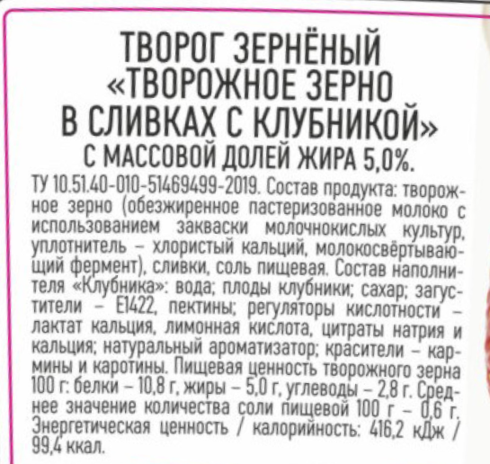 Творожное зерно (обезжиренное пастеризованное молоко с использованием закваски молочнокислых культур, уплотнитель - хлористый кальций, молокосвёртывающий фермент), сливки, соль пищевая. Состав наполнителя Клубника: вода; плоды клубники; сахар; загустители – Е1422, пектины; регуляторы кислотности – лактат кальция, лимонная кислота, цитраты натрия и кальция; натуральный ароматизатор; красители – кармины и каротины.