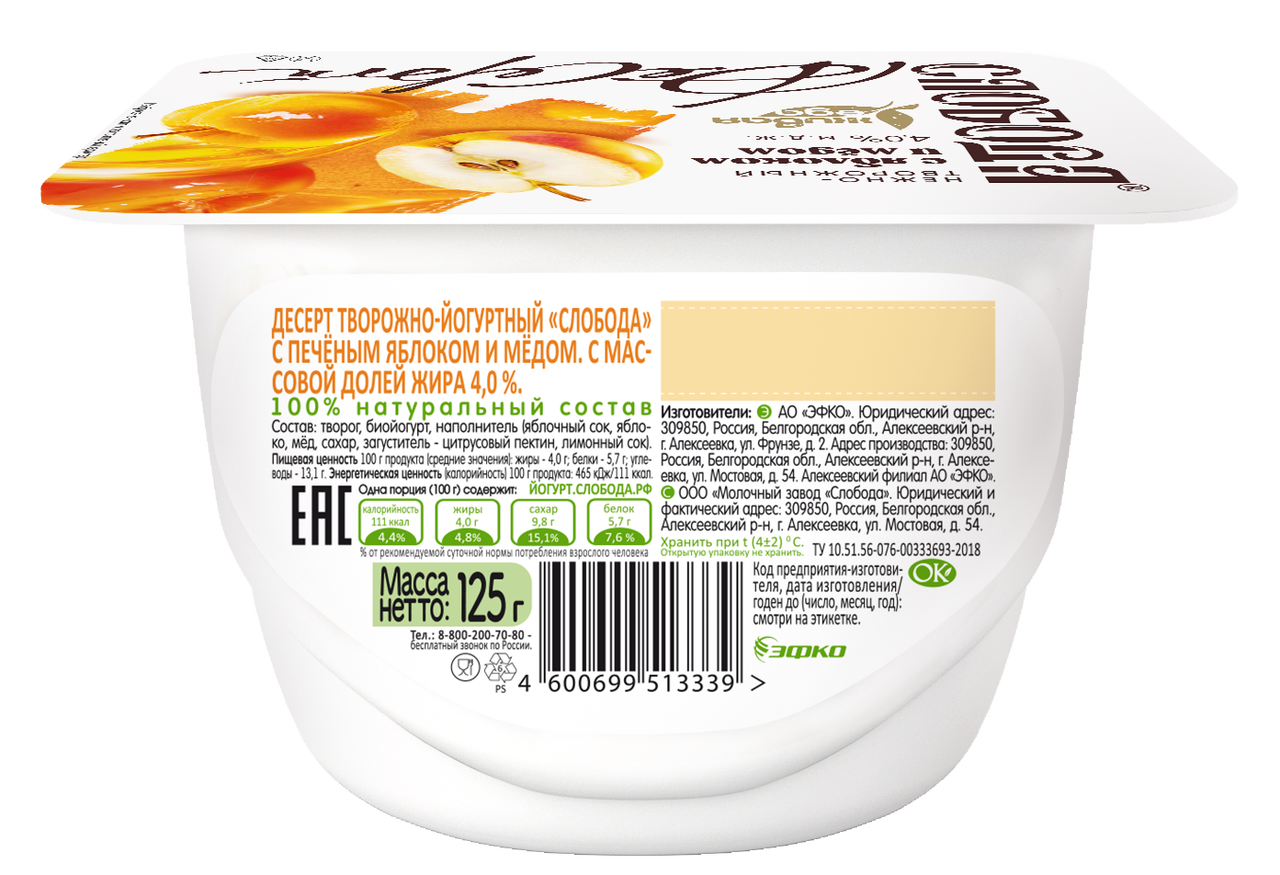 Десерт творожный СЛОБОДА мед, 125г