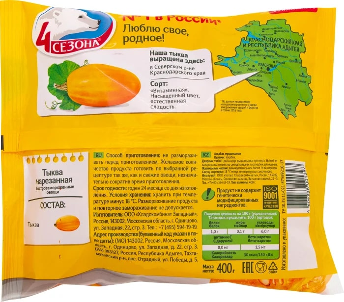 Сочная и спелая тыква 4 Сезона (400 г) позволит вам приготовить ароматное овощное рагу и вкусный суп-пюре или просто пикантную начинку для пирогов. Продукт уже порезан на кусочки, поэтому вам не придется тратить на это время. Замороженная тыква по вкусу и консистенции практически не отличается от свежей, к тому же в ней сохраняются все полезные свойства, микроэлементы и витамины. Приобрести тыкву нарезанную 4 СЕЗОНА, 400 г можно в торговом центре METRO.Состав: тыква (кубики).Энергетическая ценность, ккал/100 г: 21.Пищевая ценность в 100 г: белки — 1 г, жиры — 0,1 г, углеводы — 4,4 г.Вес товара, г: 400Страна-изготовитель: Россия.Условия хранения: хранить при температуре минус 18. Размороженный продукт повторному замораживанию не подлежит.Режим охлаждения: замороженное.Бренд: 4 Сезона.Размер упаковки (длина х ширина х высота), см: 19.5х17.5х4.Вес в упаковке, г: 400.Производитель: ЗАО Хладокомбинат Западный, Россия.