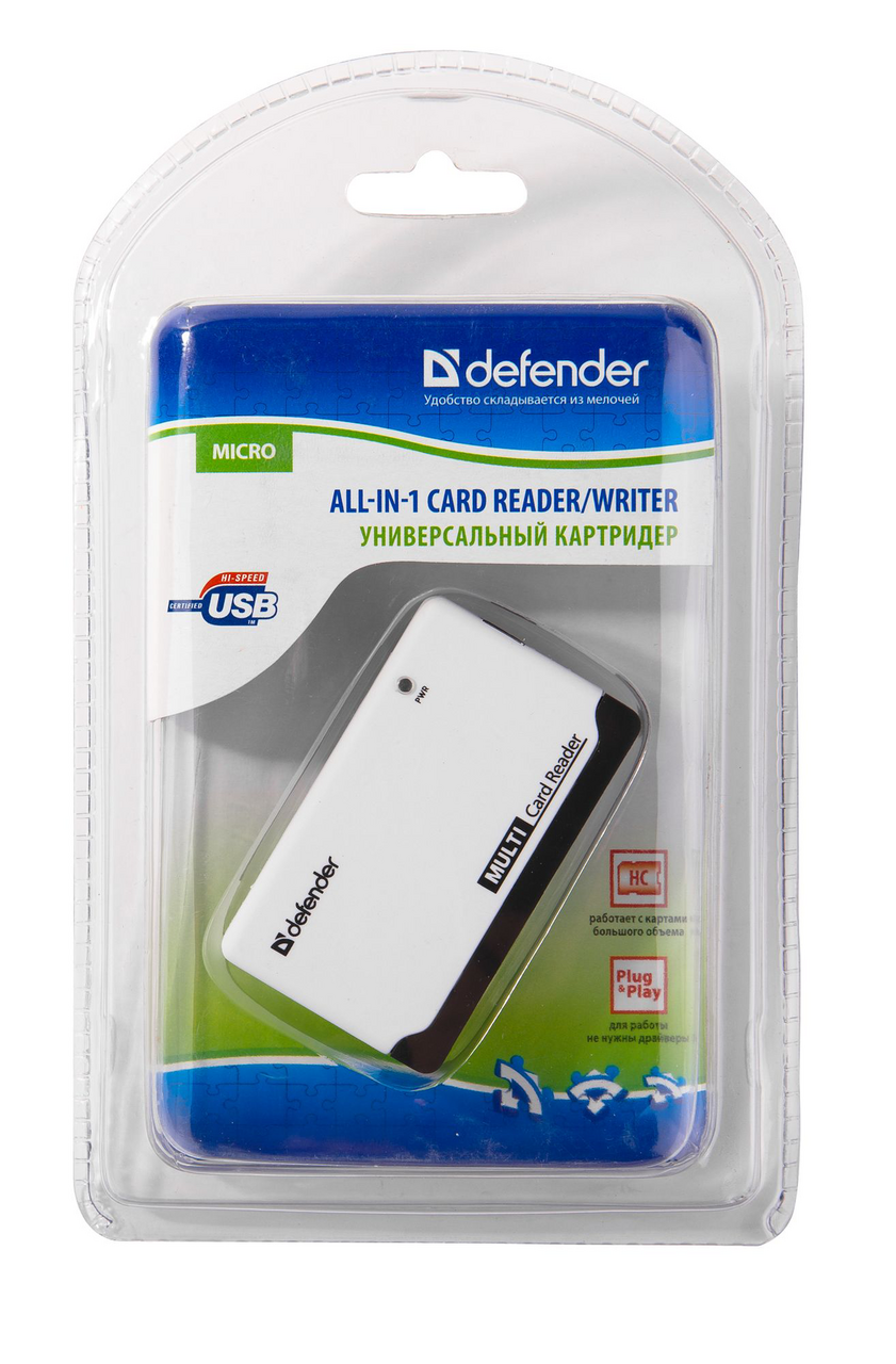 Картридер Defender- миниатюрное устройство поддерживает большинство форматов карт памяти, позволяет просматривать и редактировать файлы непосредственно на карте памяти. Длина шнура: 6 см.