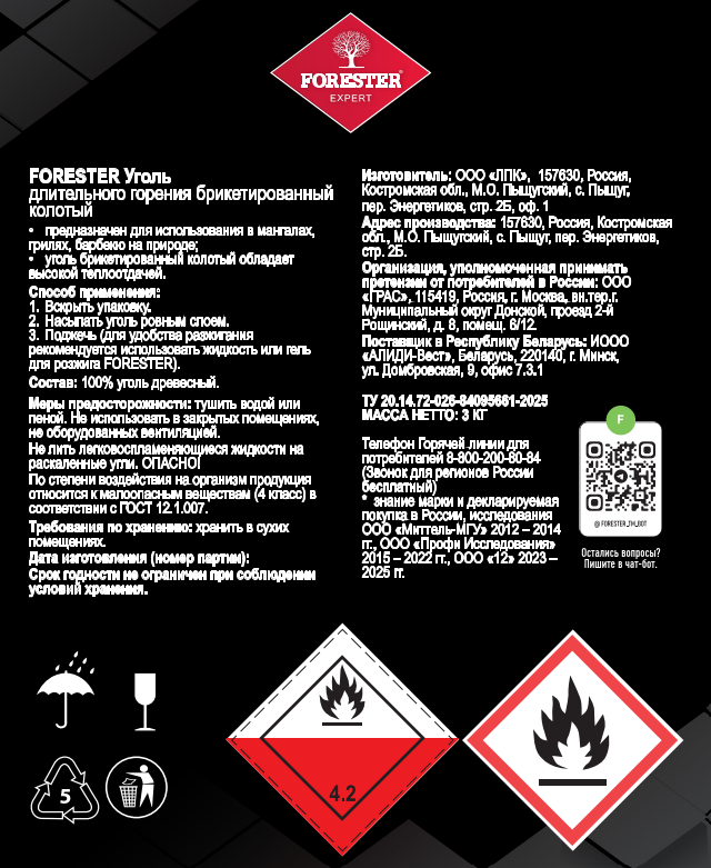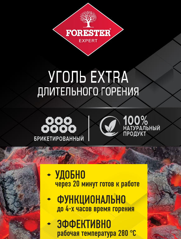 Уголь длительного горения Forester extra брикетированный, 3кг