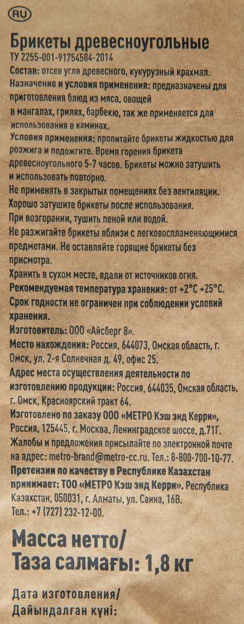 METRO PROFESSIONAL Уголь в брикетах по 1,8 кг оценят даже опытные гриль-мастера. Прессованный уголь создан с использованием высококачественного древесного угля и кукурузного крахмала в качестве связующего вещества. Благодаря этой уникальной комбинации брикеты обеспечивают длительное горение – до трех часов. Уголь подходит для использования в грилях различных типов: от уличных барбекю до профессиональных гриль-станций. Прекрасно справляется с различными видами продуктов: от сочного мяса до свежих овощей, придавая каждому блюду неповторимый аромат и вкус. Способ применения и уход: равномерно разложите уголь в гриле и примените специальные спички, стартер для ускорения процесса или жидкость для розжига. Брикеты легко разжигаются. После использования уголь оставляет минимум золы, что упрощает процесс очистки гриля.