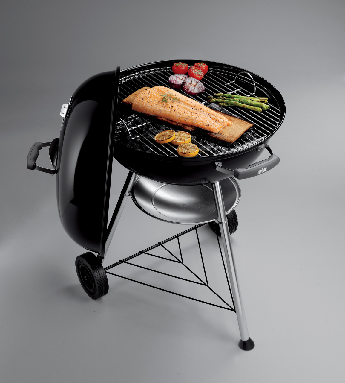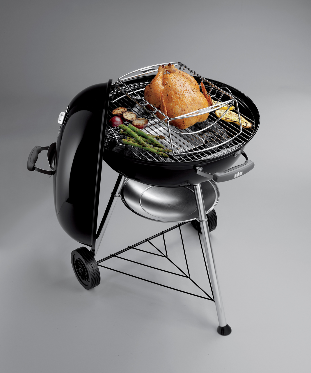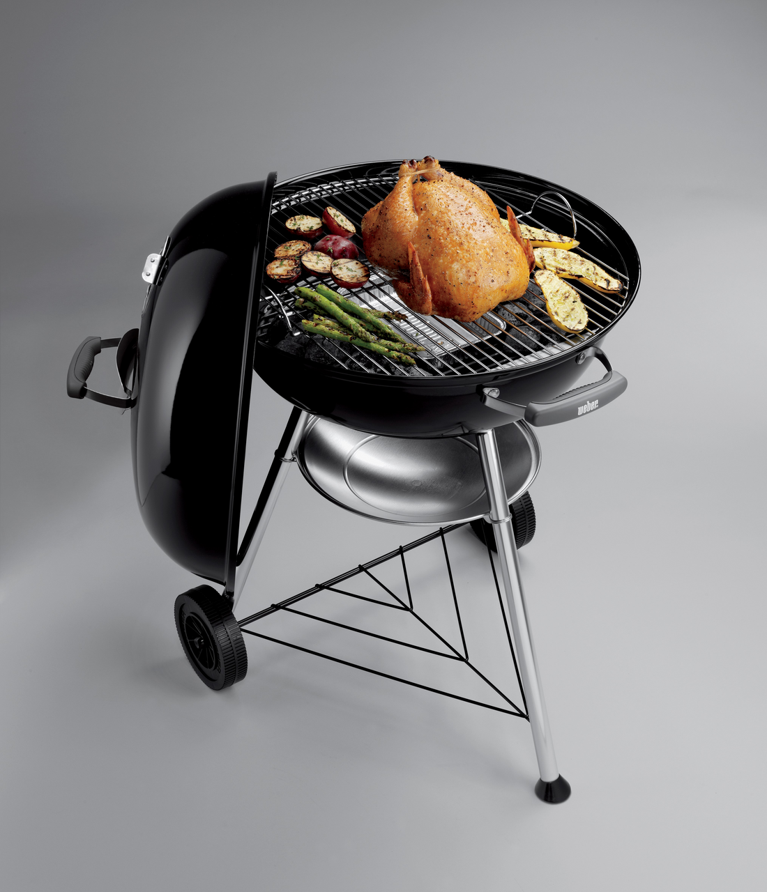 Угольный гриль Weber Compact Kettle сферической формы имеет большую рабочую поверхность для жарки тушки птицы целиком. Модель предназначена для использования на открытом воздухе. Гриль произведен из качественной стали, покрытой специальной жаростойкой эмалью. Особенности гриля: ● Крышка. Позволяет получить эффект копчения. Благодаря ручке крышку можно легко снять без риска обжечься. ● Решетки. Произведены из стали, не деформируются при нагреве. С их помощью можно создать характерный рисунок на овощах, рыбе, мясе. Для жарки целой тушки птицы удобно использовать специальную поставку. ● Зольник. Собирает пепел и остатки углей, облегчает очистку гриля после остывания. ● Вентиляционные отверстия. Расположены на крышке, помогают без усилий регулировать жар. Гриль Weber Compact Kettle работает на древесном угле, дровах или брикетах. Для хранения топлива снизу расположена металлическая решетка. Для транспортировки гриля предусмотрено два колеса, а опорная ножка с пластиковой накладкой обеспечивает устойчивость после фиксации на месте. Вес 10 кг.