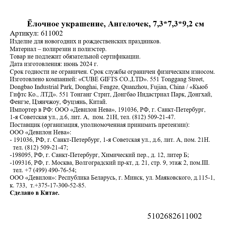Украшение елочное Ангелочек, 7.3 x 7.3 x 9.2см