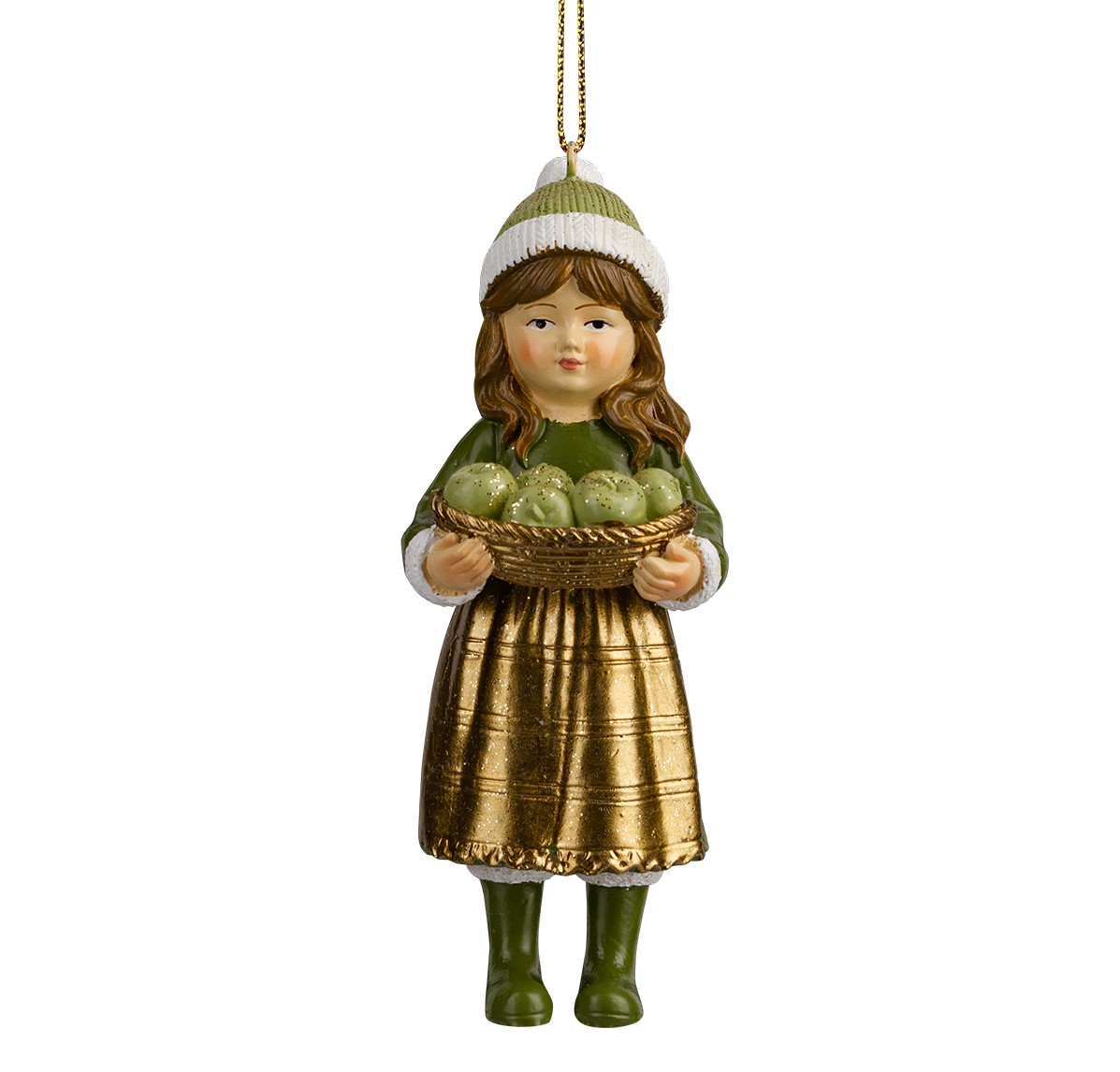 Девочка с корзиной яблок станет отличным дополнением к елке. Елочные игрушки в ретро стиле излучают особую теплоту. Классическое праздничное сочетание зеленого и золотого цвета создает атмосферу новогоднего волшебства. Детали украшения тонко прорисованы и подчеркнуты сверкающими блестками. Изделие является относительно тяжелым, предпочтительно использование на искусственной елке.